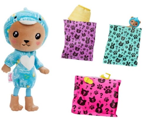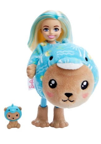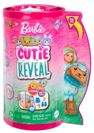 Lalki Barbie Chelsea Cutie Reveal z serii Kostiumy Zwierzaczki zapewniają fantastyczną zabawę w odkrywanie 6 niespodzianek! Zdejmij kostium, aby odsłonić lalkę Chelsea. Jak wygląda Twoja lalka? W zestawie czeka na Ciebie więcej niespodzianek, takich jak spódniczka oraz minizwierzątko dopasowane do kostiumu lalki. Po odwróceniu na drugą stronę góra kostiumu staje się obszerną kurtką, a głowę kostiumu można zmienić w legowisko dla minizwierzątka. Odkryj magiczną transformację i za pomocą zimnej wody zmień kolor na zwierzątku – ciepła woda pozwala wrócić do oryginalnego wyglądu.