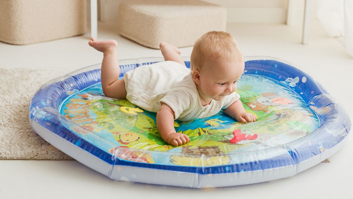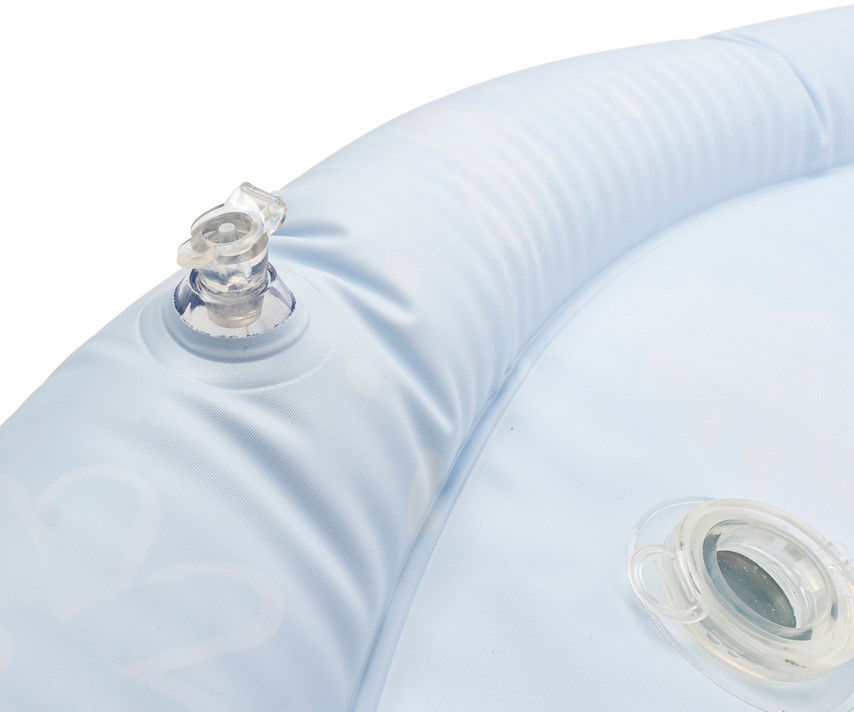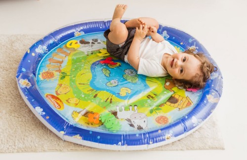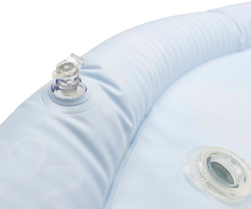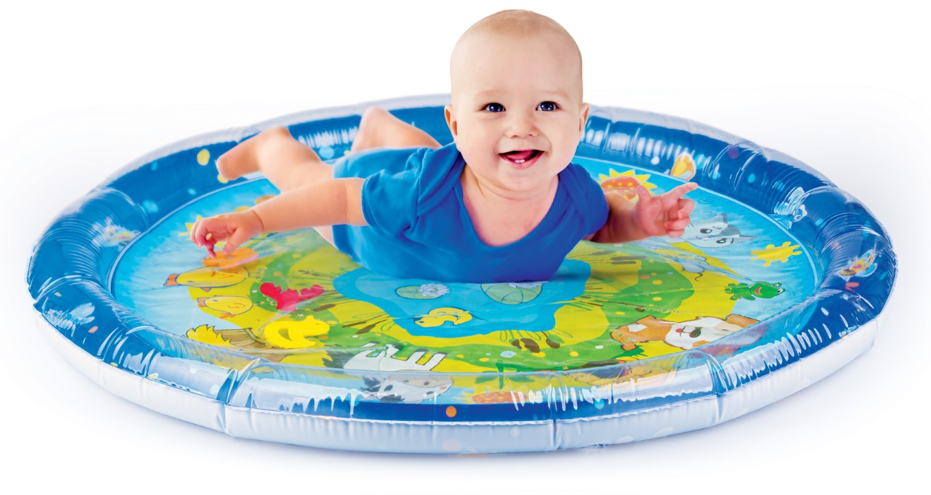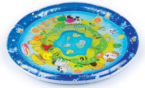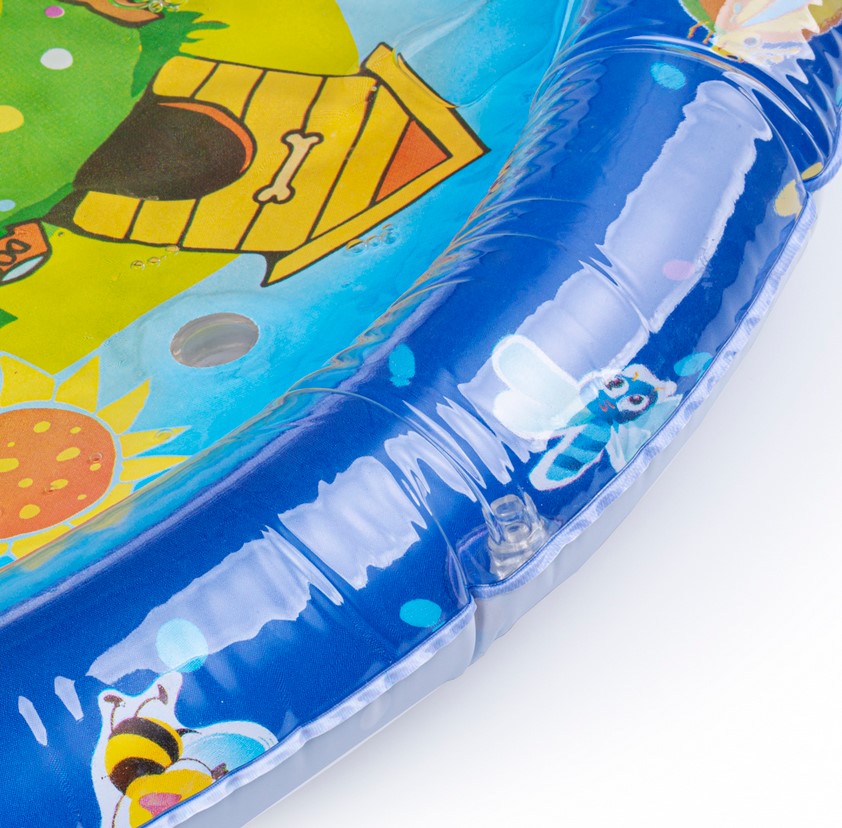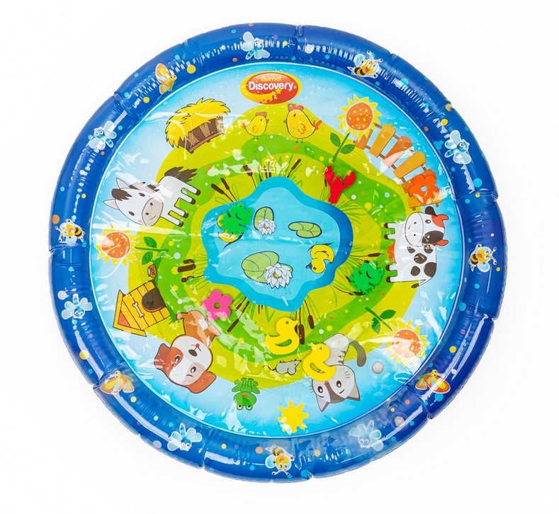 Wesołe dryfowanie bo bajkowym stawie! Duża mata zapewni maluchowi przestrzeń do zabawy w falowanie i obserwowanie kolorowych kształtów, pływających w jej wnętrzu. Krawędź zawiera zawór do nadmuchania brzegu maty, natomiast spód maty wyposażony jest w zawór do napełniania wodą. Kiedy dziecko usiądzie, położy się na środku maty lub przyciśnie go rączką, woda zafaluje, wprawiając w ruch kolorowe kształty. Aby mata mogła służyć jak najdłużej, należy napełniać ją wyłącznie wodą destylowaną i pamiętać o tym, aby po zakończonej zabawie wylać wodę, pozostawiając matę do wyschnięcia.