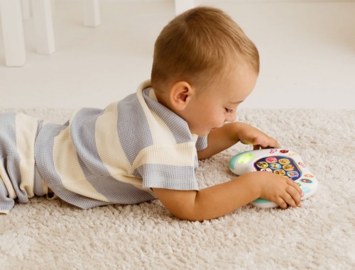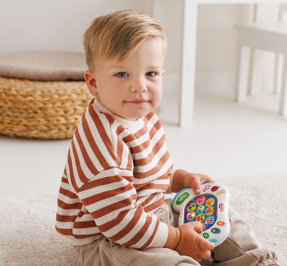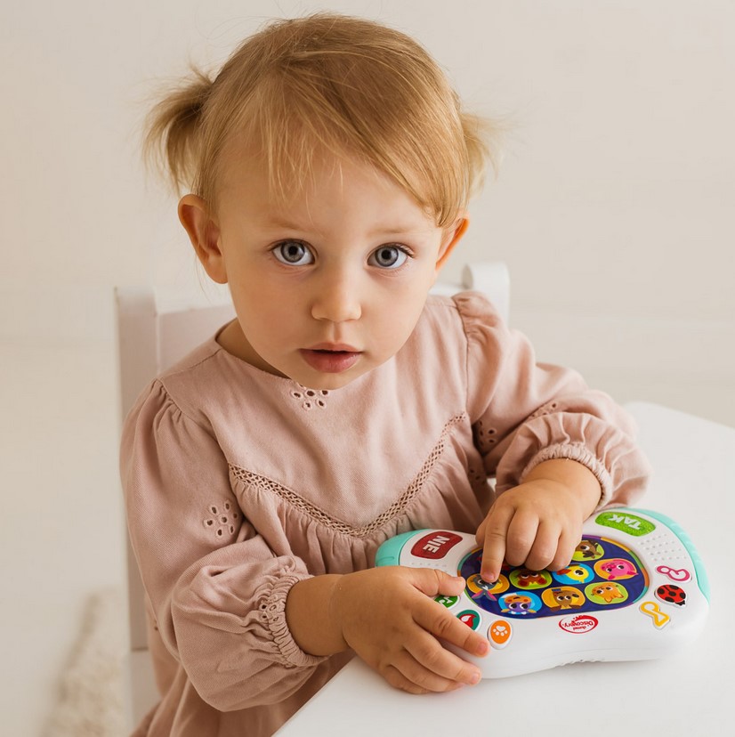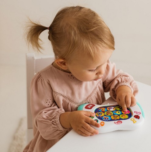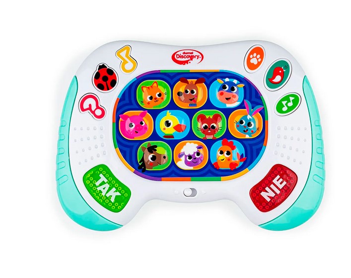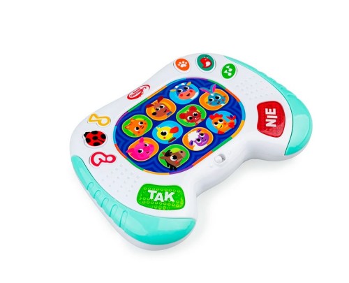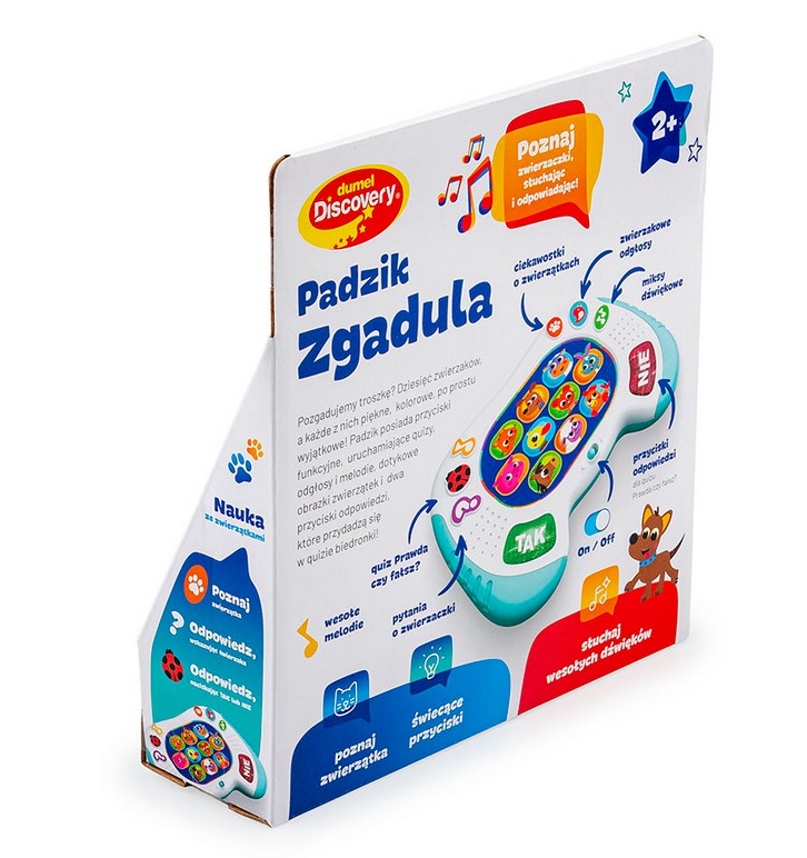 Pobaw się ze zwierzątkami w zgadywanki! Ten kompaktowy padzik wyposażony jest w kolorowe przyciski. Znajdziemy tu guziczki z podobiznami zwierzątek oraz przyciski aktywujące tryb zabawy: ciekawostki o zwierzątkach, dźwiękowe niespodzianki, takie jak zwierzęce odgłosy, dźwiękowe miksy czy wesołe melodie, a także quiz biedronki, działający na zasadzie gry „prawda czy fałsz”. Aby udzielić odpowiedzi na usłyszane pytanie, należy nacisnąć jeden z podświetlanych guziczków: TAK lub NIE. Zabawka wyposażona jest w praktyczny przełącznik ON/OFF, co umożliwia jej wyłączenie po zakończonej zabawy.