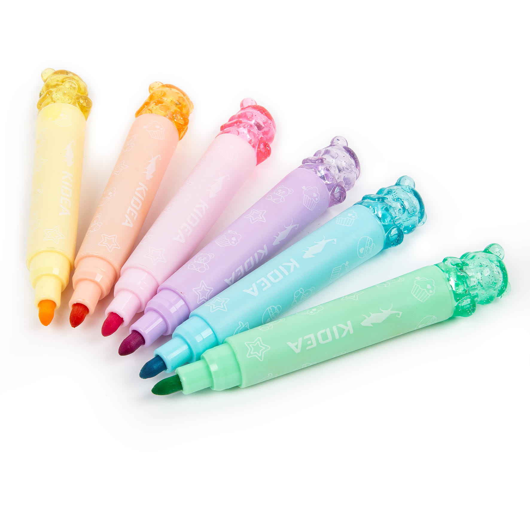 Na jednym końcu znajduje się flamaster z precyzyjną końcówką, natomiast na drugim – samotuszujący stempelek: gwiazdka, babeczka, donut, miś, kotek oraz lody. Flamastrom dodatkowego uroku dodają brokatowe zakrętki w kształcie misiów. Dzięki kompaktowym rozmiarom, pastelowe flamastry zmieszczą się w każdym piórniku. Idealnie sprawdzą się do podkreślania, rysowania czy dekorowania prac plastycznych.