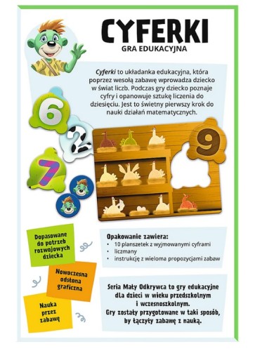 Cyferki to kolorowa układanka edukacyjna, która poprzez zabawę wprowadza najmłodszych w świat liczb. Podczas rozgrywki dziecko poznaje cyfry i uczy się liczyć do dziesięciu. Dzięki różnorodnym formom zabawy dzieci rozwijają podstawowe umiejętności matematyczne, uczą się porównywać ilości, ćwiczą koncentrację oraz spostrzegawczość.