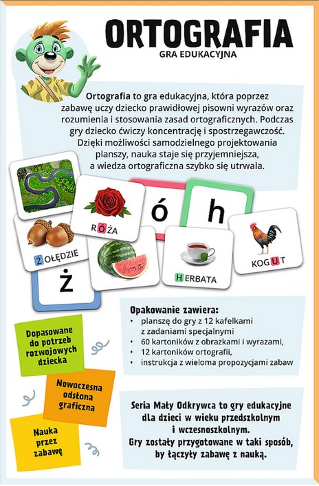 Ortografia to gra edukacyjna, która poprzez zabawę uczy dziecko prawidłowej pisowni wyrazów z trudnościami ortograficznymi oraz pomaga przy rozumieniu i stosowaniu zasad ortograficznych. Wprowadzenie możliwości zbudowania własnej planszy do gry pozytywnie wpływa na proces przyswajania wiedzy.
