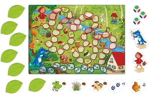 Czerwony Kapturek to kooperacyjna gra planszowa, w którą mogą bawić się już najmłodsze dzieci. Waszym zadaniem będzie dotarcie do domku babci zanim zrobi to wilk. Podczas wędrówki musicie zebrać ukryte pod liśćmi leśne smakołyki.