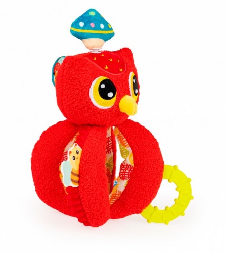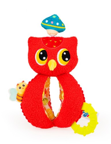 Na głowie sowy znajduje się obracający się grzybek – wystarczy pociągnąć kółeczko z gąsienicą, by wprawić go w ruch. Miękki gryzaczek przymocowany do zabawki pomoże ząbkującym maluszkom przynieść ulgę.