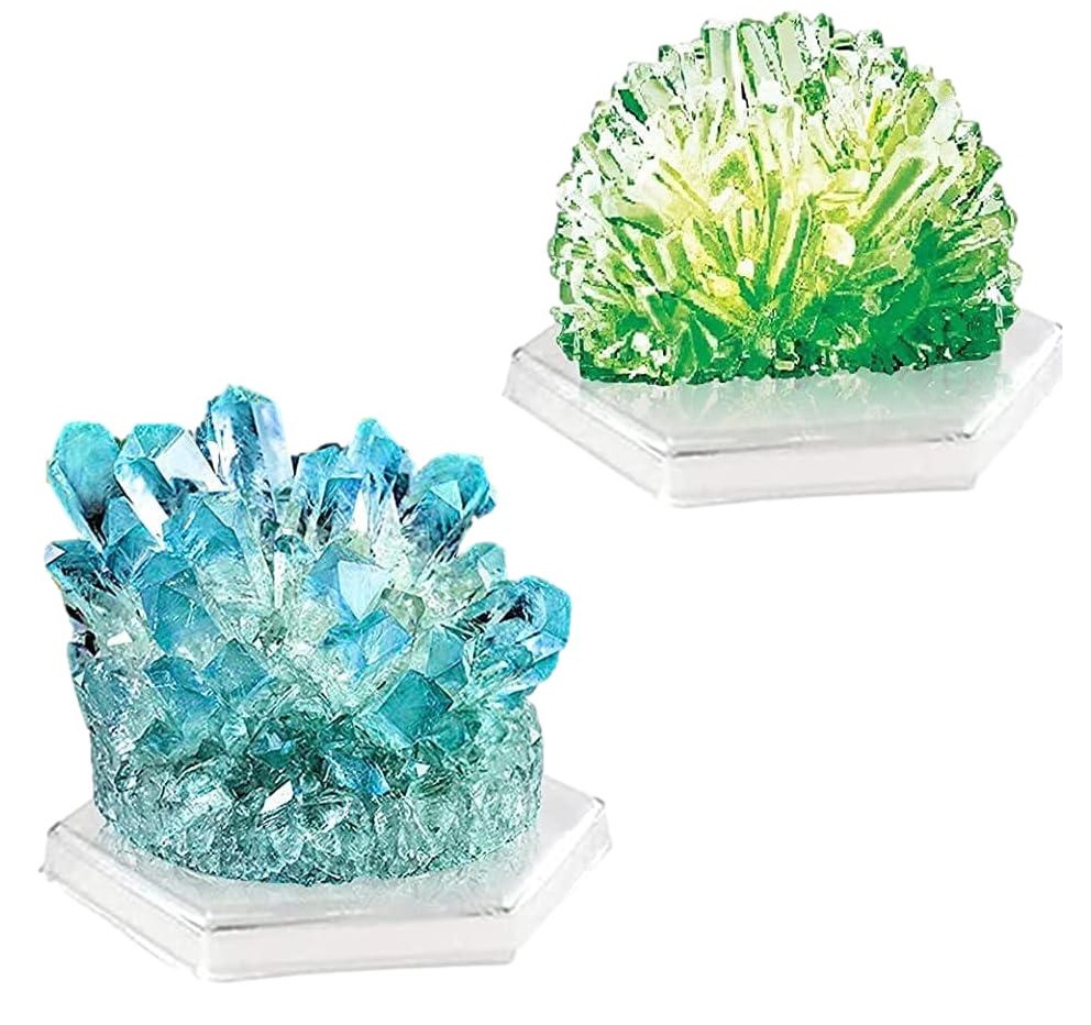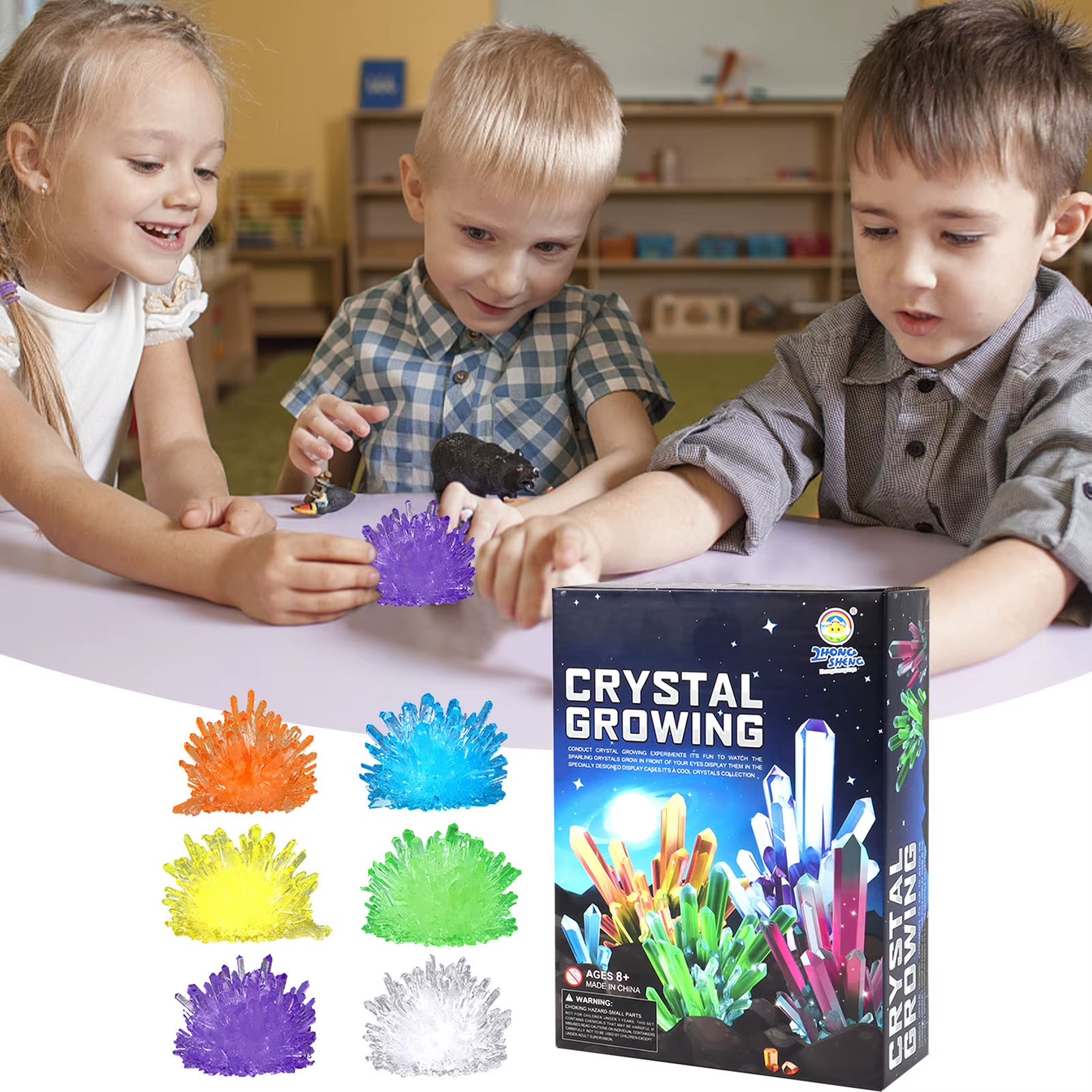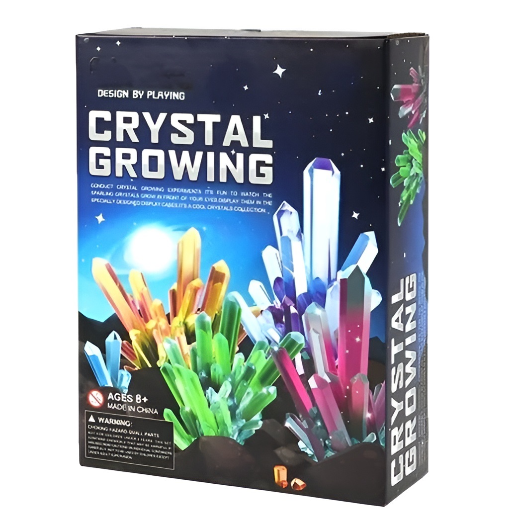 Krok 1: Weź 160 ml wrzącej wody o temperaturze 100 stopni do dostępnego kubka o pojemności 200 ml - Krok 2: Wlej opakowanie kryształowego proszku do kubka i użyj patyczka do wymieszania, aby rozpuścić proszek. - Krok 3: Odczekaj 15 minut, aż roztwór ostygnie do 40 stopni, a następnie upuść zarodek kryształu na środek na dnie kubka. (nie zakrywaj kubka) - Krok 4: Pozostaw kryształy w nienaruszonym stanie na co najmniej 48 godzin (przechowywać w miejscu niedostępnym dla małych dzieci). Kryształy najlepiej rosną w miejscach bezpyłowych, w temperaturach około 20 stopni. - Krok 5: Gdy kryształy są wystarczająco duże (7 – 10 dni), należy je opłukać wodą- myć tylko przez krótki czas, jeśli zajmie to dużo czasu, kryształy się rozpuszczą. Krok 6: Gdy kryształy i przezroczysta powłoka całkowicie wyschną, umieść je na warstwie podstawowej i przykryj przezroczystą pokrywką, aby chronić je przed wilgotnym powietrzem.