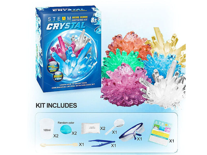 Krok 1: Weź 160 ml wrzącej wody o temperaturze 100 stopni do dostępnego kubka o pojemności 200 ml - Krok 2: Wlej opakowanie kryształowego proszku do kubka i użyj patyczka do wymieszania, aby rozpuścić proszek. - Krok 3: Odczekaj 15 minut, aż roztwór ostygnie do 40 stopni, a następnie upuść zarodek kryształu na środek na dnie kubka. (nie zakrywaj kubka) - Krok 4: Pozostaw kryształy w nienaruszonym stanie na co najmniej 48 godzin (przechowywać w miejscu niedostępnym dla małych dzieci). Kryształy najlepiej rosną w miejscach bezpyłowych, w temperaturach około 20 stopni. - Krok 5: Gdy kryształy są wystarczająco duże (7 – 10 dni), należy je opłukać wodą- myć tylko przez krótki czas, jeśli zajmie to dużo czasu, kryształy się rozpuszczą. Krok 6: Gdy kryształy i przezroczysta powłoka całkowicie wyschną, umieść je na warstwie podstawowej i przykryj przezroczystą pokrywką, aby chronić je przed wilgotnym powietrzem.