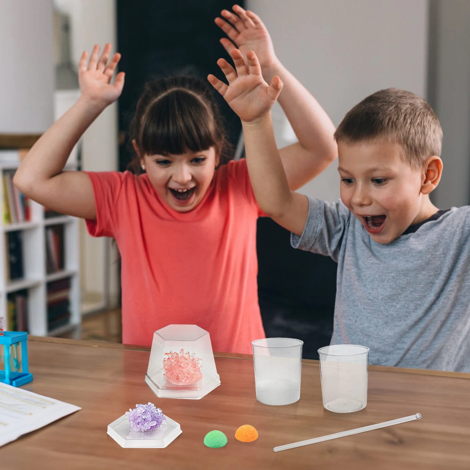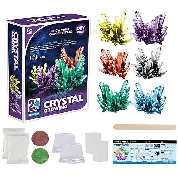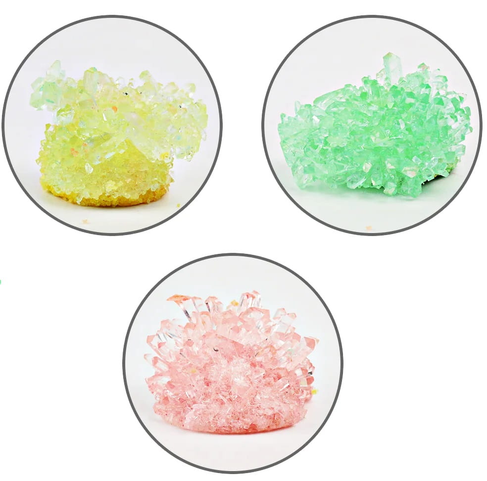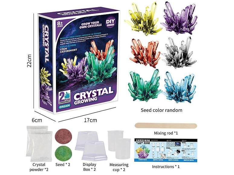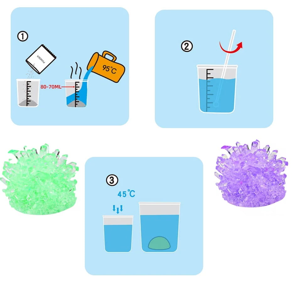 Krok 1: Weź 160 ml wrzącej wody o temperaturze 100 stopni do dostępnego kubka o pojemności 200 ml - Krok 2: Wlej opakowanie kryształowego proszku do kubka i użyj patyczka do wymieszania, aby rozpuścić proszek. - Krok 3: Odczekaj 15 minut, aż roztwór ostygnie do 40 stopni, a następnie upuść zarodek kryształu na środek na dnie kubka. (nie zakrywaj kubka) - Krok 4: Pozostaw kryształy w nienaruszonym stanie na co najmniej 48 godzin (przechowywać w miejscu niedostępnym dla małych dzieci). Kryształy najlepiej rosną w miejscach bezpyłowych, w temperaturach około 20 stopni. - Krok 5: Gdy kryształy są wystarczająco duże (7 – 10 dni), należy je opłukać wodą- myć tylko przez krótki czas, jeśli zajmie to dużo czasu, kryształy się rozpuszczą. Krok 6: Gdy kryształy i przezroczysta powłoka całkowicie wyschną, umieść je na warstwie podstawowej i przykryj przezroczystą pokrywką, aby chronić je przed wilgotnym powietrzem.