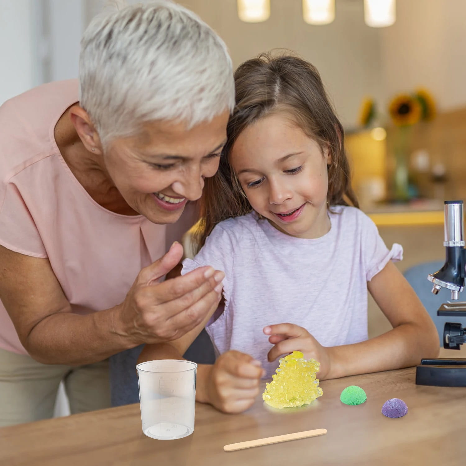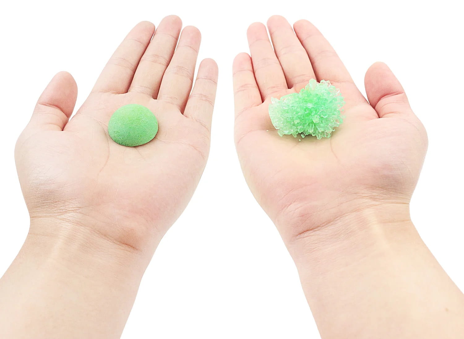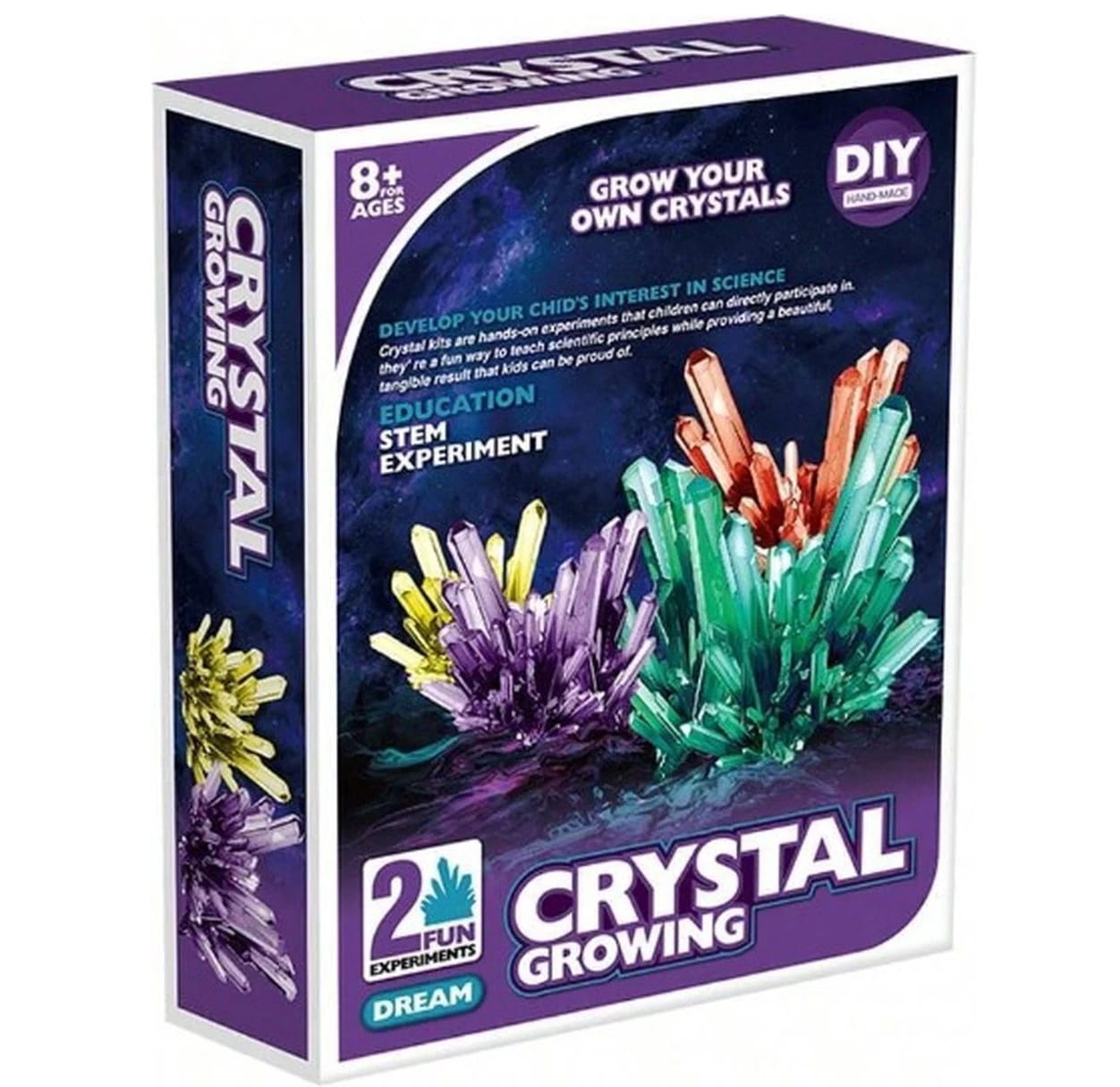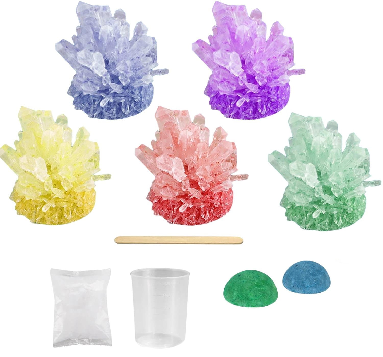 Krok 1: Weź 160 ml wrzącej wody o temperaturze 100 stopni do dostępnego kubka o pojemności 200 ml - Krok 2: Wlej opakowanie kryształowego proszku do kubka i użyj patyczka do wymieszania, aby rozpuścić proszek. - Krok 3: Odczekaj 15 minut, aż roztwór ostygnie do 40 stopni, a następnie upuść zarodek kryształu na środek na dnie kubka. (nie zakrywaj kubka) - Krok 4: Pozostaw kryształy w nienaruszonym stanie na co najmniej 48 godzin (przechowywać w miejscu niedostępnym dla małych dzieci). Kryształy najlepiej rosną w miejscach bezpyłowych, w temperaturach około 20 stopni. - Krok 5: Gdy kryształy są wystarczająco duże (7 – 10 dni), należy je opłukać wodą- myć tylko przez krótki czas, jeśli zajmie to dużo czasu, kryształy się rozpuszczą. Krok 6: Gdy kryształy i przezroczysta powłoka całkowicie wyschną, umieść je na warstwie podstawowej i przykryj przezroczystą pokrywką, aby chronić je przed wilgotnym powietrzem.