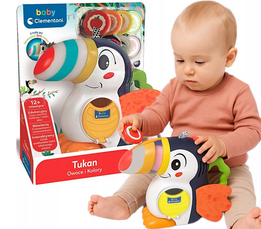 Edukacyjny i zabawny Tukan: Ta zabawka z kolorowym dziobem bawi maluchy zabawnymi piosenkami i rymami. Idealny dla dzieci od 12 miesiąca życia, zachęca do wczesnej nauki w zabawny i atrakcyjny sposób