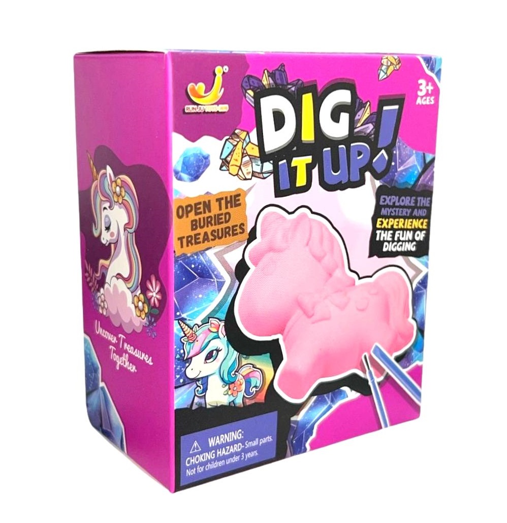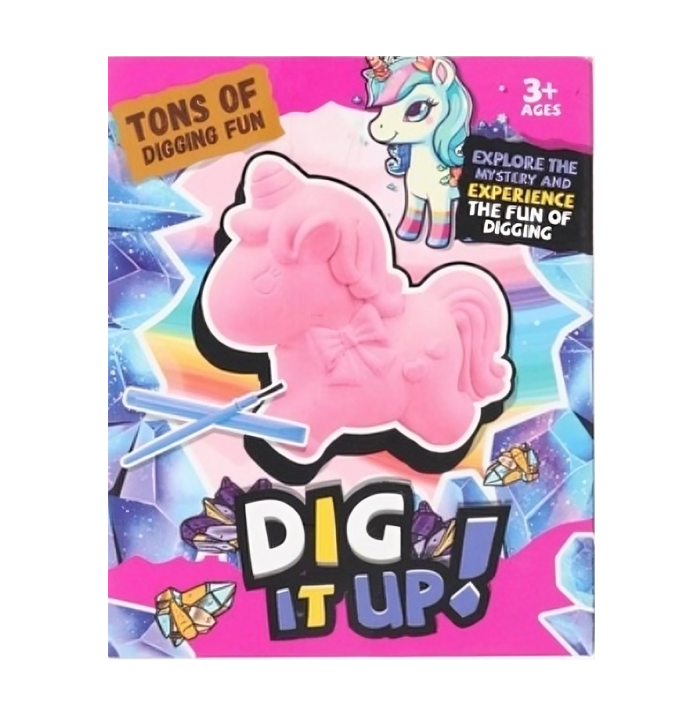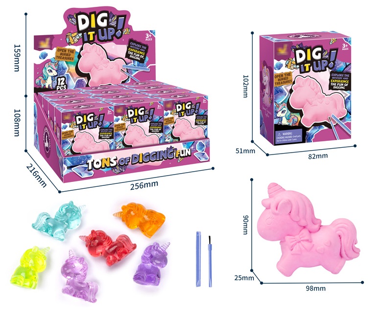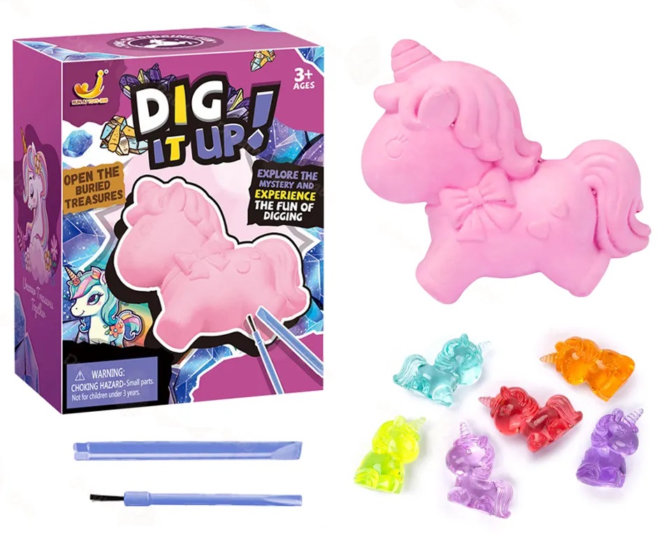✨Za pomocą narzędzia odkrywca drąży w gipsowym koniku i znajduje uroczego, mini jednorożca.