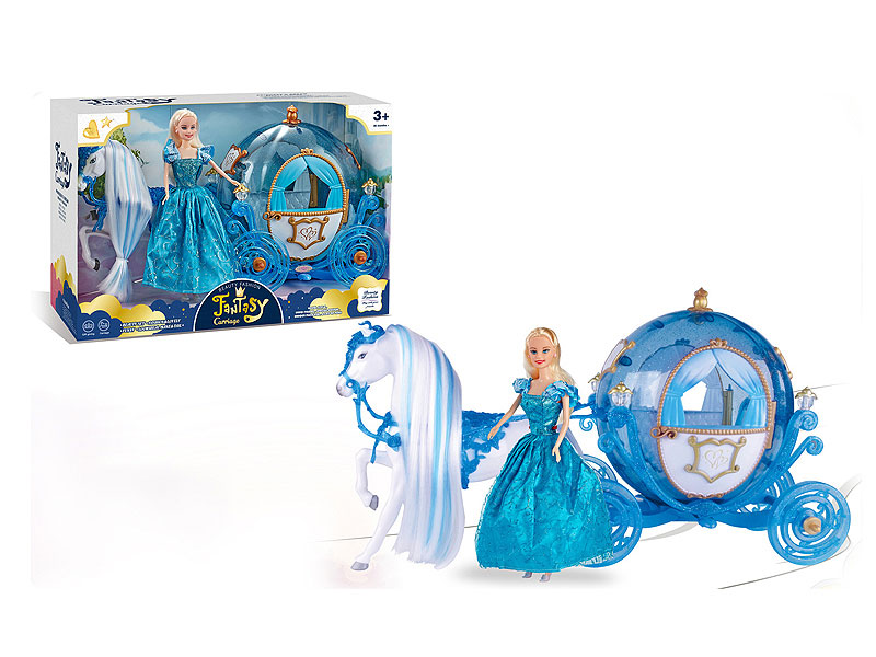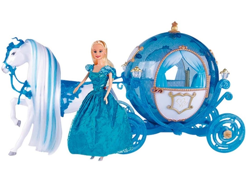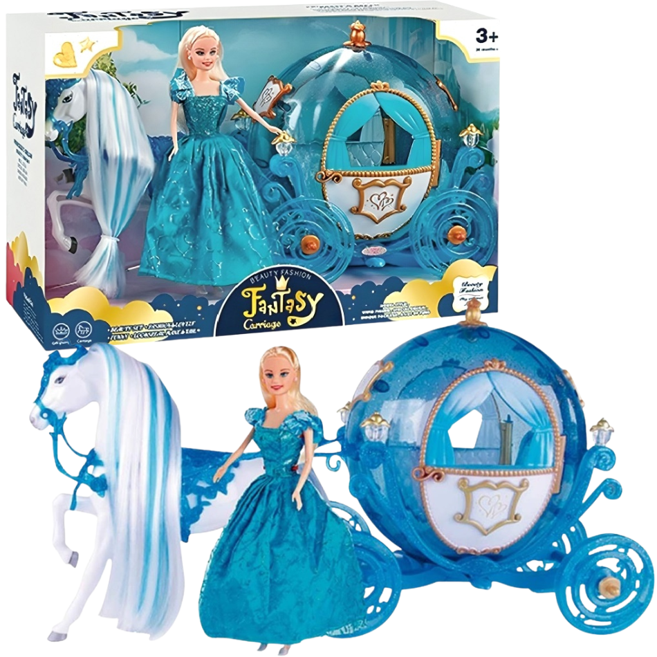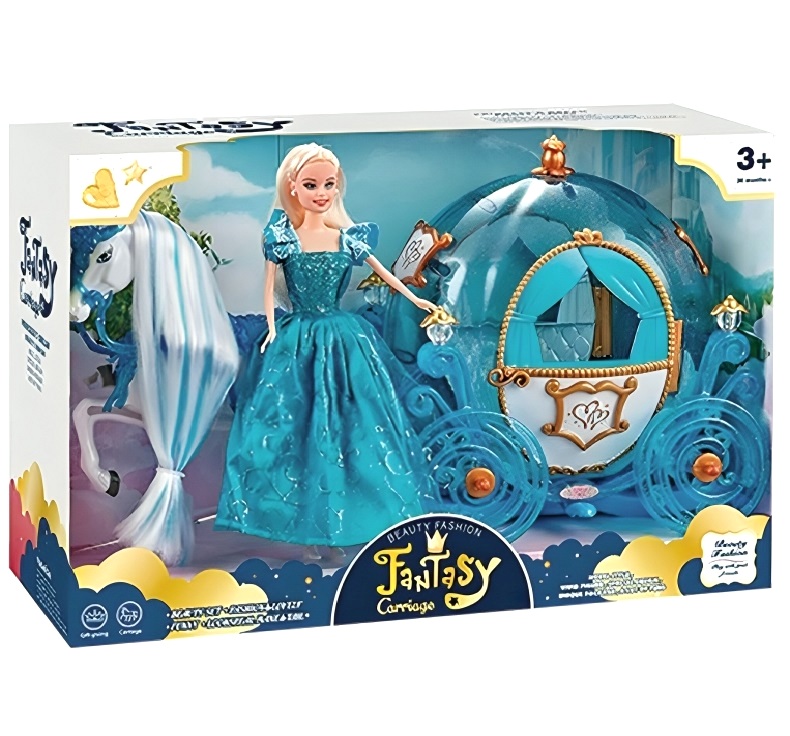 Bajkowy zestaw w skład, którego wchodzą: lalka w balowej sukni oraz śliczny biały rumak z karetą, do której lalka może wsiąść.