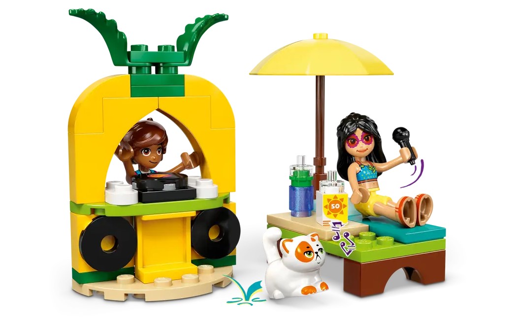 - Akcesoria do kreatywnej zabawy — ten zestaw LEGO® zawiera urocze akcesoria pobudzające kreatywność, w tym krem przeciwsłoneczny, dwa lody na patyku, napój i mikrofon