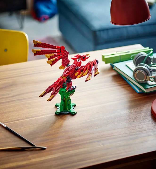 - Średniowieczne stworzenia do zabawy i ozdoby — figurki można ustawić na półce lub stoliku nocnym. Model feniksa ma dodatkowo podstawkę zbudowaną z klocków