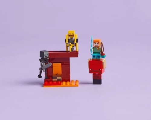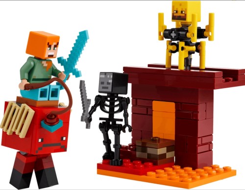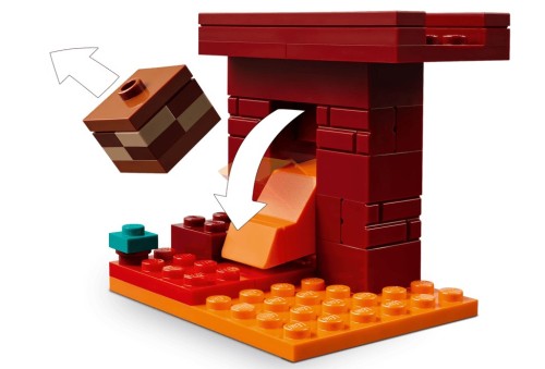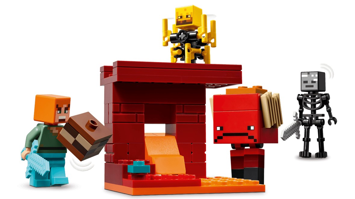 Dzieci dołączą do Alex, bohaterki z gry Minecraft, podczas poszukiwania pradawnych zgliszczy na moście Netheru w szkarłatnym lesie. Gdy Alex podnosi zgliszcza, elementy lawy automatycznie spływają, a postacie — mroczny szkielet z kamiennym mieczem i płomyk z różdżką zagradzają jej drogę. Dzieci użyją kultowego diamentowego miecza do walki z mobami, a potem uciekną na figurce magmołaza, który ma ruchome nogi i siodło. Gracze w Minecrafta wiedzą, że muszą dysponować spaczonym grzybem, aby móc kontrolować magmołaza. Dodatkową cyfrową zabawę zapewnia aplikacja LEGO Builder, w której dzieci mogą powiększać i obracać model w 3D na swoim urządzeniu.