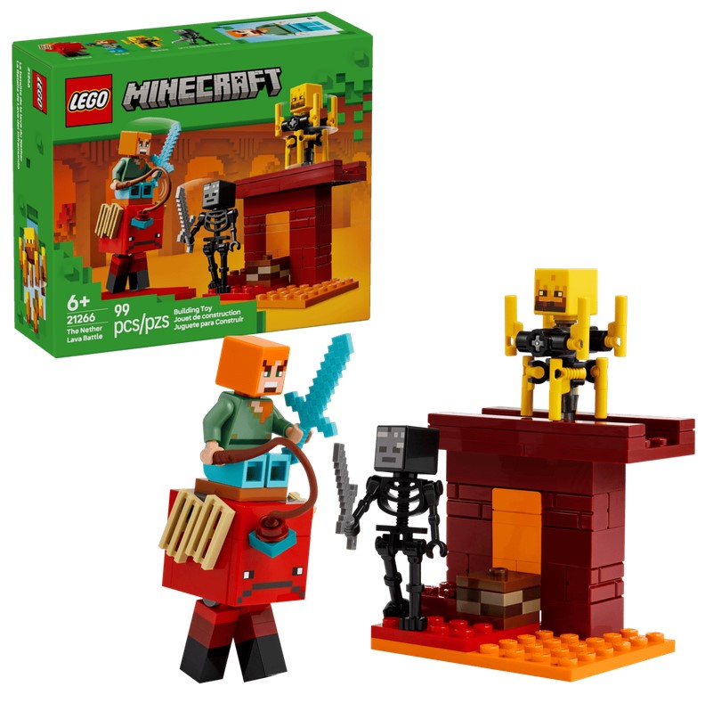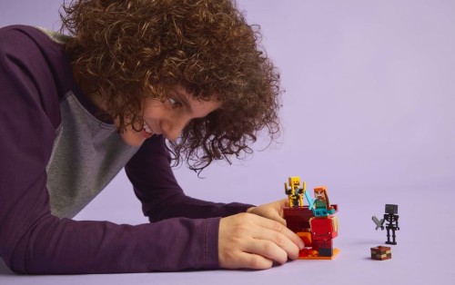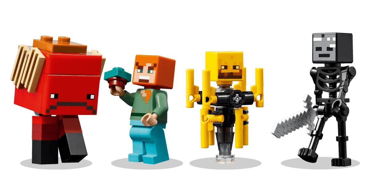 - Zestaw z gry Minecraft® — zawiera most fortecy Netheru do zbudowania oraz figurki LEGO® Minecraft z bronią i akcesoriami: Alex, mroczny szkielet i magmołaza