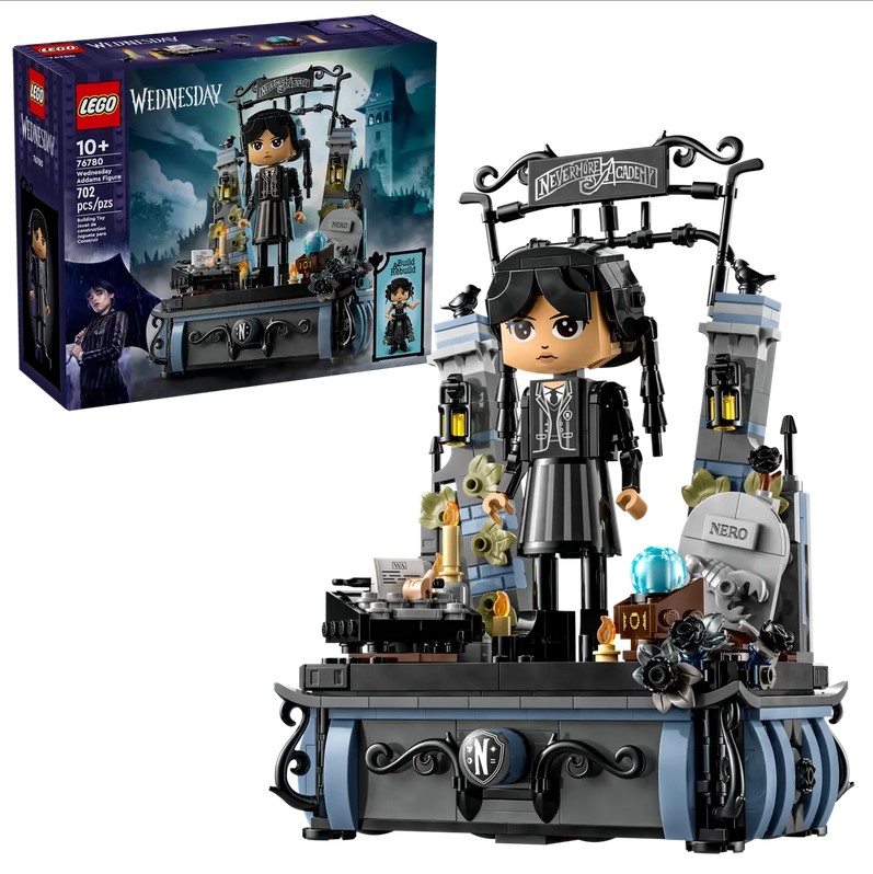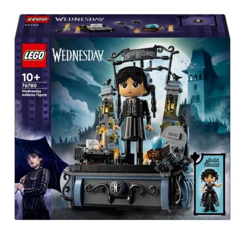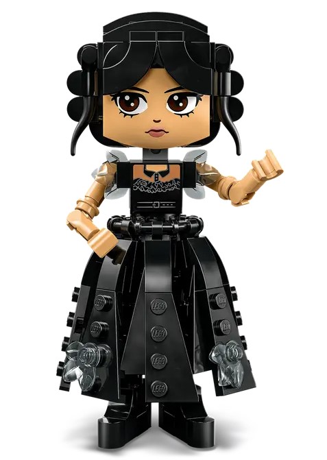 Na dziesięciolatków i starsze dzieci czekają tajemnice i chaos w zestawie Figurka Wednesday Addams. Ten zestaw z serii LEGO® Wednesday zawiera kolekcjonerski model z ruchomą głową, ramionami i stopami, a także dwie twarze i dwie stylizacje, dzięki którym figurkę można przebudowywać. Ponadto obejmuje lojalnego pomocnika Rączkę, podstawkę z czarnymi daliami i dwa schowki na skarby, takie jak sukienka ze szkolnego balu lub mundurek. Całości dopełnia brama Akademii Nevermore i akcesoria, takie jak maszyna do pisania Wednesday, grób Nero, szklana kula i inne.