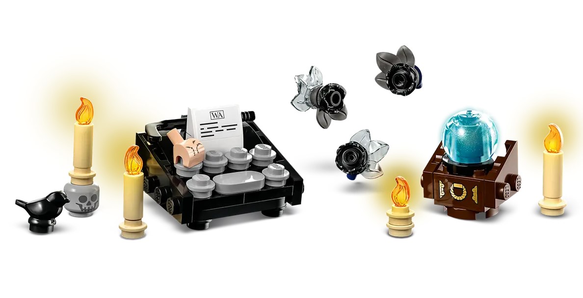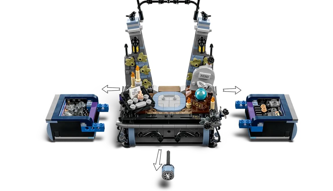 - Zestaw pełen tajemnic — zawiera zbudowaną z klocków figurkę Wednesday z dwiema twarzami i dwiema stylizacjami, a także postać Rączki, podstawkę z dwoma zamykanymi skrytkami i rozmaite akcesoria