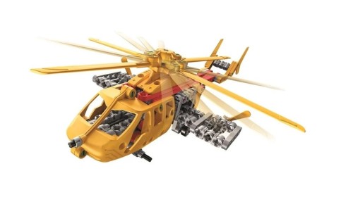 Zestaw zawiera elementy potrzebne do złożenia modelu wyposażonego w łopaty, koła zębate i ruchome części odwzorowujące pracę prawdziwego helikoptera.