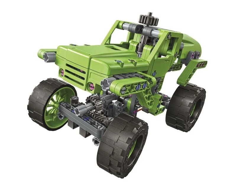 Potężne koła, terenowy prześwit i mechaniczne detale sprawiają, że ten monster truck od razu wygląda jak maszyna gotowa na domowy tor przeszkód. To konstrukcyjna propozycja dla dzieci, które lubią budować pojazdy krok po kroku i przy okazji zobaczyć, jak pracują przekładnie oraz inne elementy układu mechanicznego.