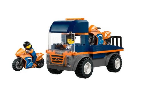 Pokaż dzieciom w wieku od czterech lat świat pomysłowej zabawy dzięki zestawowi LEGO City Laweta dla motocykli (60491). Ten zestaw pojazdów zawiera ciężarówkę z platformą i grubymi gumowymi oponami, dwa sportowe motocykle oraz dwie minifigurki kierowców wyścigowych w kaskach. Dzieci mogą załadować i rozładować motocykle za pomocą rampy, odgrywać epickie wyścigi motocyklowe i posadzić minifigurkę w kabinie, aby przeżywać niesamowite przygody na drodze.