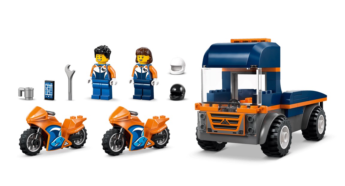 - Zawartość pudełka — zawiera wszystko, czego dzieci potrzebują do zbudowania zabawkowej ciężarówki z platformą, dwóch zabawkowych motocykli oraz dwie minifigurki kierowców, które pobudzają wyobraźnię i zachęcają do zabawy oraz opowiadania historii