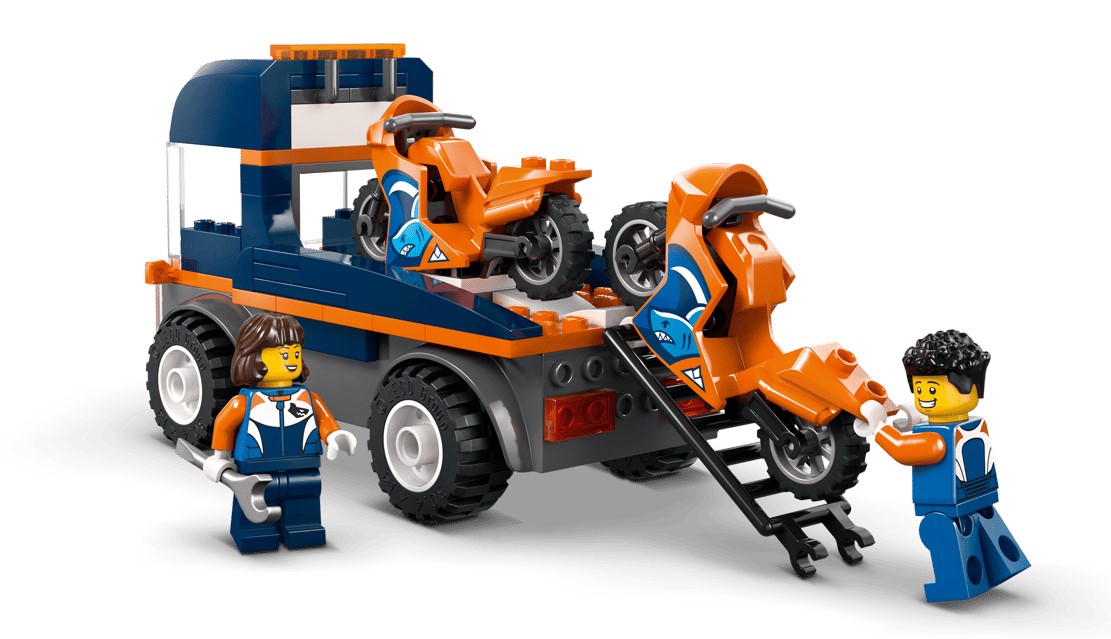 - Zabawki do odgrywania ról — dzieci mogą posadzić minifigurkę w kabinie ciężarówki z platformą i przyczepić rampę, aby załadować i rozładować dwa modele motocykli