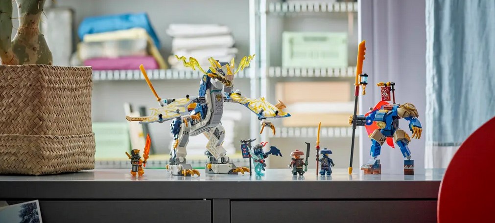 - Mech i smok — dzieci mogą bawić się zabawkami osobno lub przymocować ruchomego mecha do pleców pierwszego w historii mecha-smoka NINJAGO®, aby stworzyć Mecha smoczego jeźdźca Rogue’a