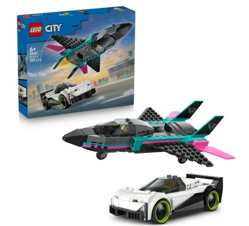 Spraw, aby każdy dzień był wyjątkowy dzięki temu zestawowi z samolotem odrzutowym i samochodem. To świetny prezent dla chłopców i dziewczynek w wieku od sześciu lat, którzy uwielbiają zabawkowe wyścigówki i samoloty. Dzieci mogą połączyć ten zestaw z innymi zestawami LEGO City, by zwiększyć możliwości zabawy (zestawy sprzedawane osobno).