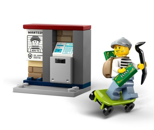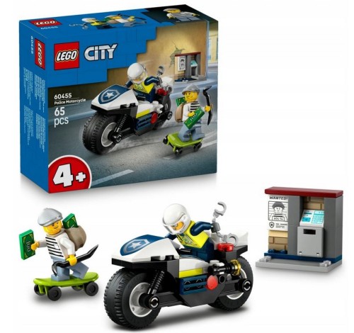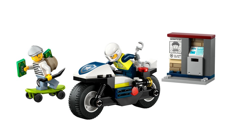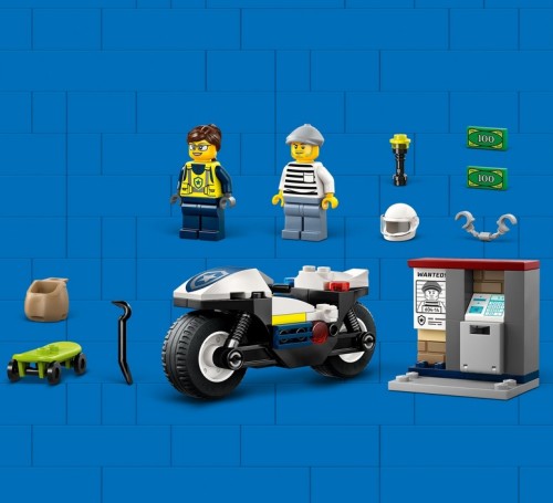 Zrób niespodziankę małym bohaterom w wieku od czterech lat tym ekscytującym zestawem LEGO® City Pościg na motocyklu policyjnym. Zawiera on fajny policyjny motocykl z szerokimi oponami, deskorolkę złodziejaszka i otwierany mini bankomat z banknotem. Wystarczy dodać minifigurki policjanta i złodziejaszka, aby spędzić wiele godzin na pomysłowej zabawie i opowiadaniu historii.