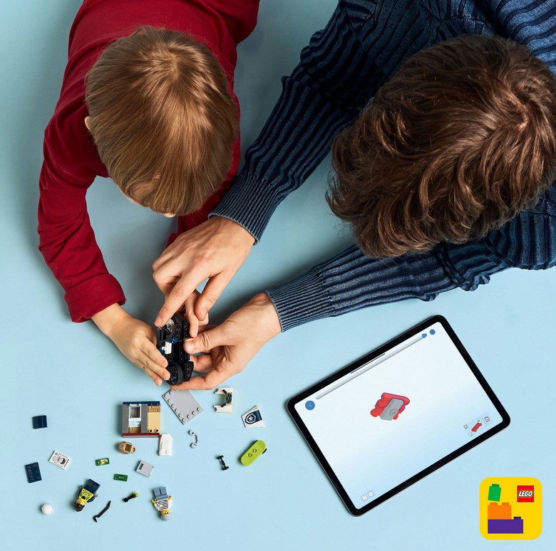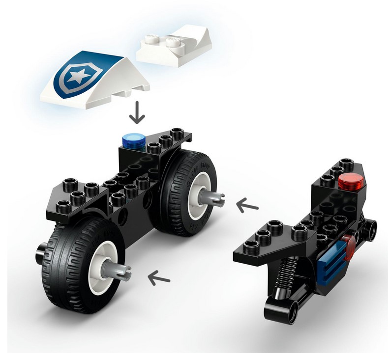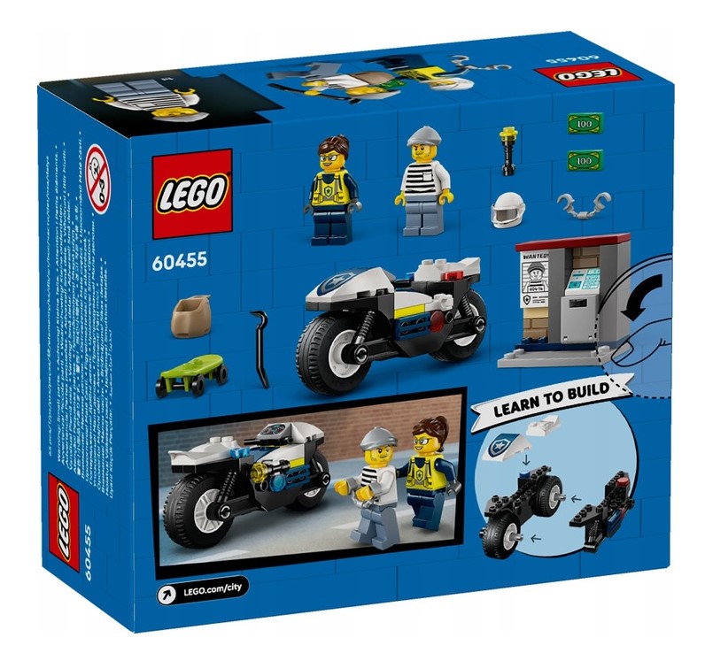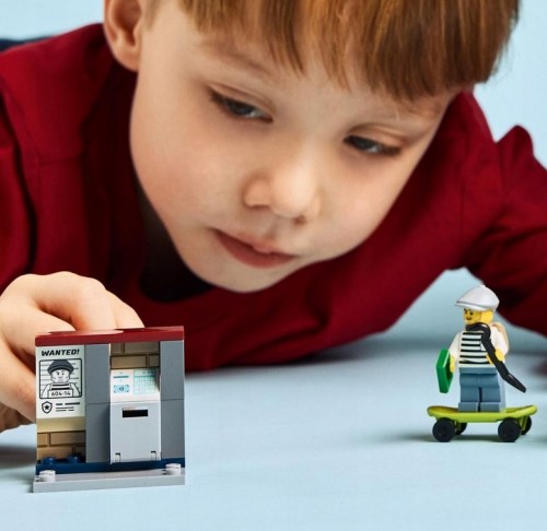 - Zawartość zestawu — wszystko, czego dzieci potrzebują do zbudowania policyjnego motocykla, deskorolki i bankomatu, a także minifigurki policjanta i skejtera do odgrywania ról