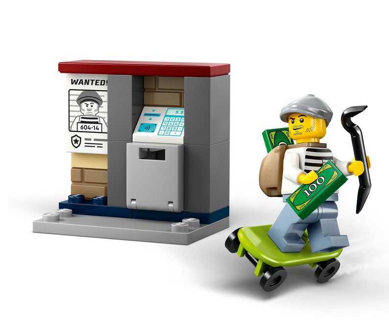 - Zabawka dla dzieci, które lubią odgrywać scenki — dzieci mogą posadzić policjanta na motocyklu, postawić złodziejaszka na deskorolce i umieścić zabawkowy banknot w bankomacie