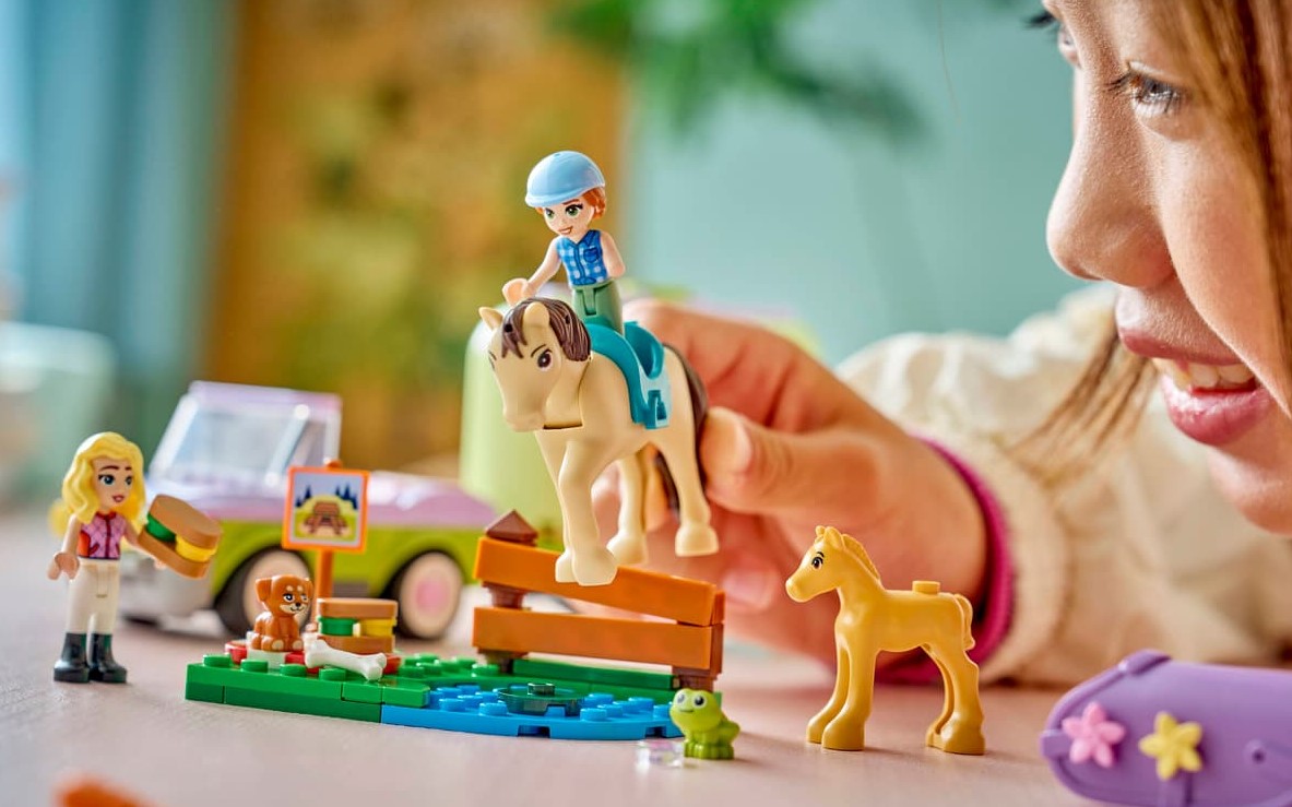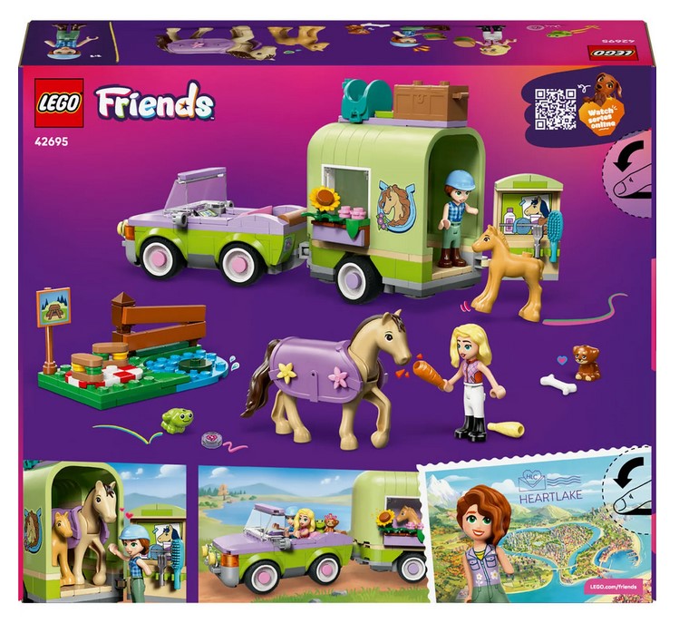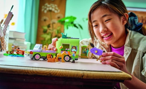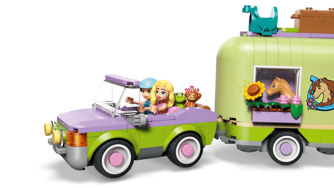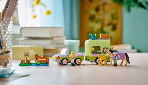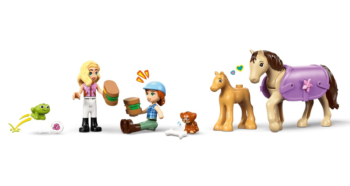 Zestaw LEGO Friends Przyczepa z koniem i źrebaczkiem (42695) zapewni siedmiolatkom i starszym dzieciom wiele godzin zabawy w opiekę nad zwierzętami. Ten zestaw dla miłośników koni zawiera dwie minilaleczki oraz figurki konia, źrebaka, szczeniaka i żaby. Poznaj wszystkie aspekty opieki nad zwierzętami podczas zabawy szczegółowymi akcesoriami do pielęgnacji koni, przewieź je w przyczepie i pokonuj przeszkody podczas jazdy konnej.