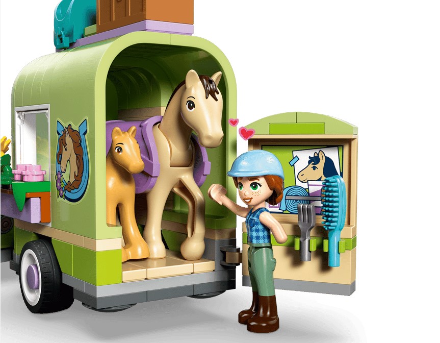 - Mnóstwo akcesoriów — akcesoria w tym zestawie LEGO® Friends obejmują płotek do skakania, siodło, kanapki, skrzynkę, szczotkę, marchewki dla koni oraz dwa małe kwiatki do ozdobienia derki dla konia