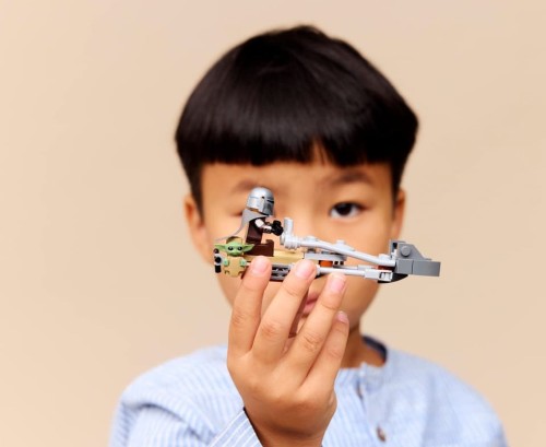 - Model śmigacza — zamocuj karabin blasterowy z tyłu pojazdu, posadź Mandalorianina za kierownicą, a Grogu umieść w sakwie z boku