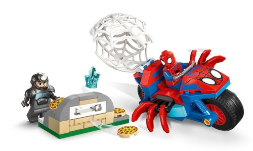 Dzieci pomagają Spidey`emu odzyskać skradziony niebieski klejnot, unikają latających pizz wystrzeliwanych z pieca Rhino i łapią Rhino w gigantyczną pajęczą pułapkę, która pasuje również do motocykla. Zaprojektowany z myślą o początkujących konstruktorach, ten zestaw konstrukcyjny jest pełen detali, które inspirują dzieci do nieograniczonej, kreatywnej zabawy. To doskonały prezent na urodziny lub inną okazję dla fanów serialu Spidey i super-kumple.