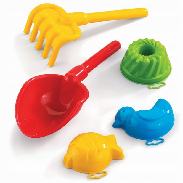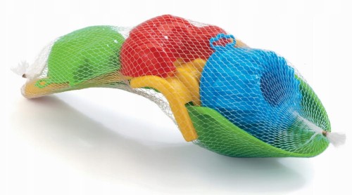 Komplet zawiera łopatkę, grabki i trzy foremki. Całość spakowana jest w siatkę.