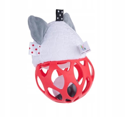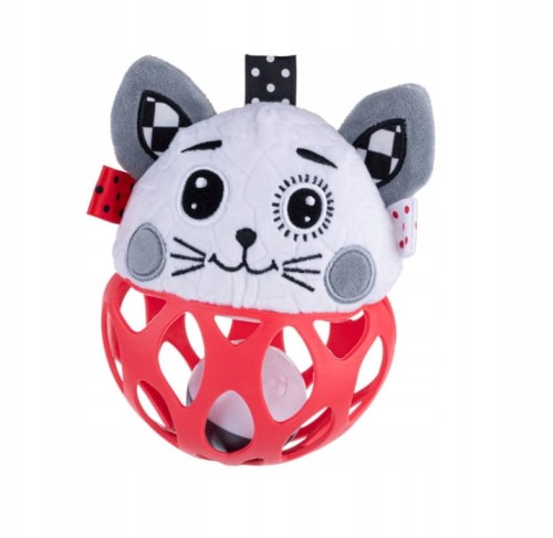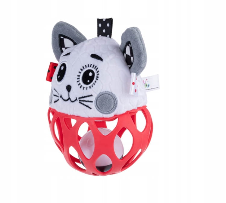 - Uroczy kotek zdobi miękką piłeczkę, w której wnętrzu znajduje się grzechotka.