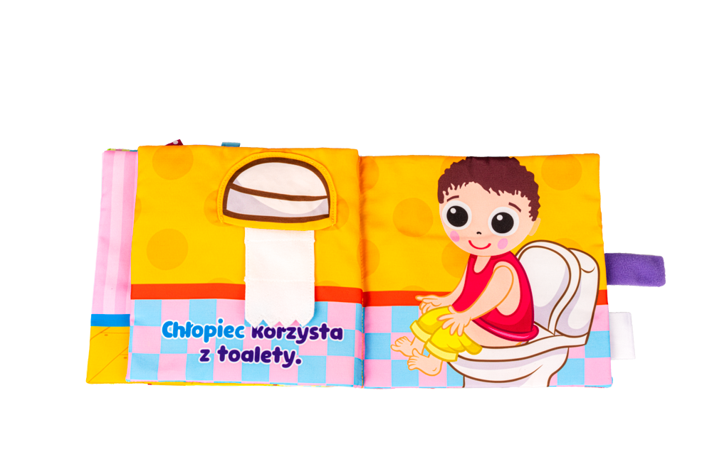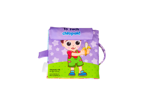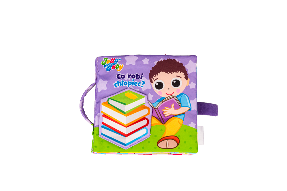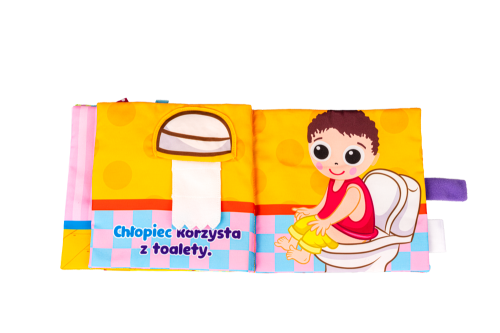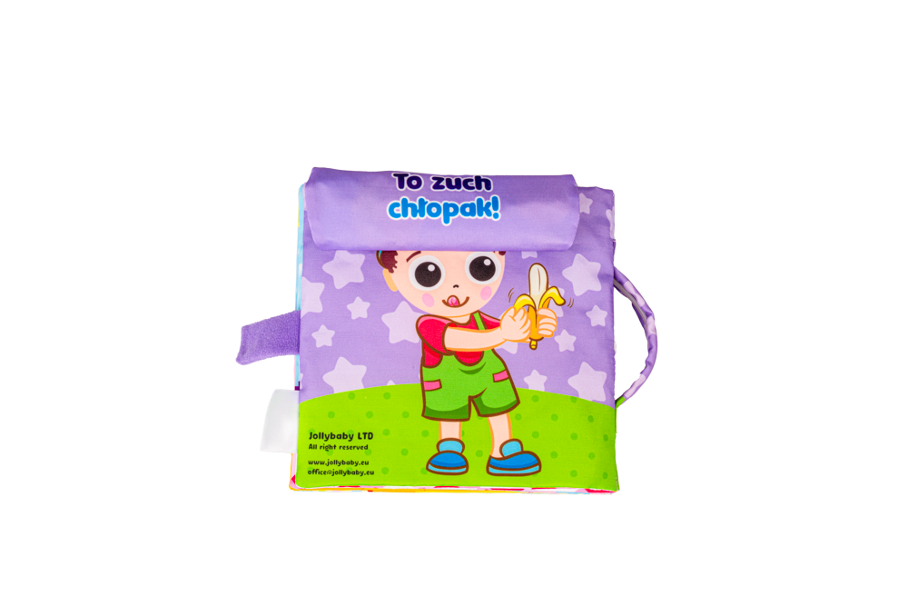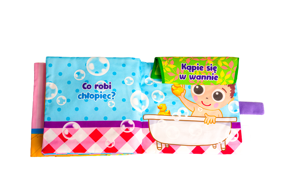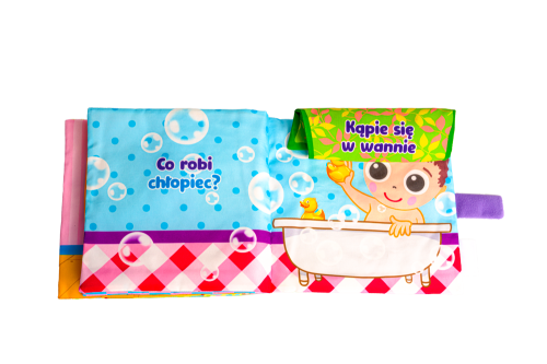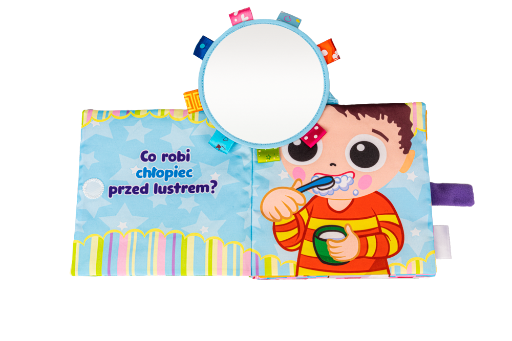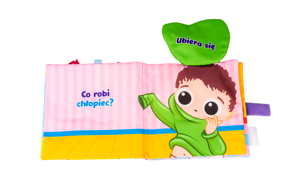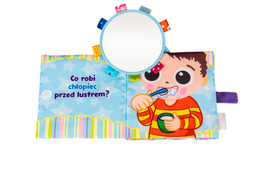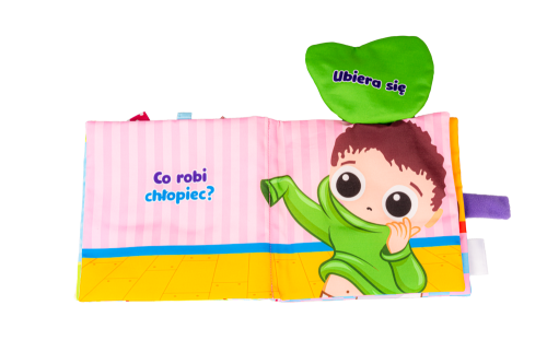 Bohaterem tej książeczki jest chłopiec, który wykonuje swoje codzienne czynności. Poznaj je, odkrywając każdą z kolorowych stron! Znajdziemy tu różne dodatkowe elementy, w postaci piszczałki, bezpiecznego lusterka do samopoznania dziecka oraz szeleszczących łatek, które uatrakcyjnią zabawę, rozwijając zdolności poznawcze dziecka. Książeczka została wyposażona również w praktyczne zapięcie na rzep oraz uchwyt, znajdujący się na grzbiecie.