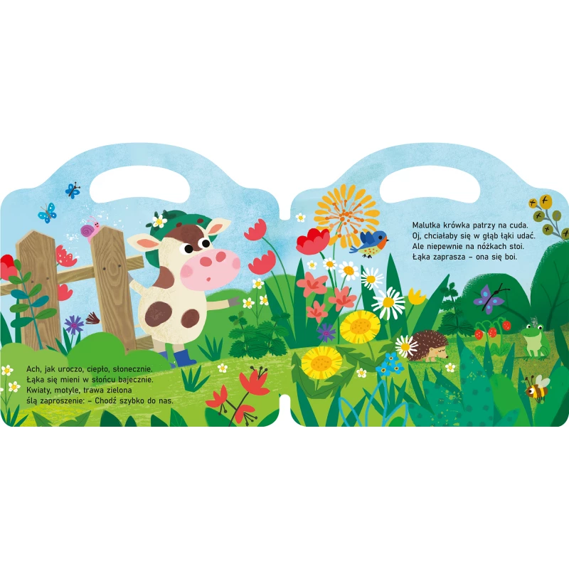 Mała krówka chce poznać świat, ale boi się wszystkiego, co nowe. Boi się cykania w trawie, brzęczenia na łące, kopca mrówek – ciekawi ją to, ale nie ma odwagi podejść bliżej. Na szczęście jest mama, która krok po kroku wprowadza ją w otaczający świat i przedstawia nowe zwierzątka. Rymowana opowiastka o ciekawości małej krówki i miłości mamy do dziecka. Kartonowa książeczka jest bezpieczna i trwała w użyciu, a format odpowiedni dla małych rączek.