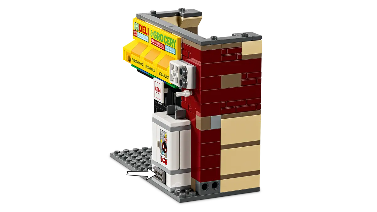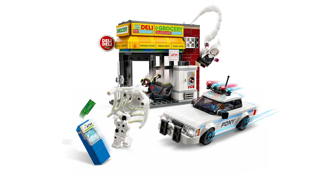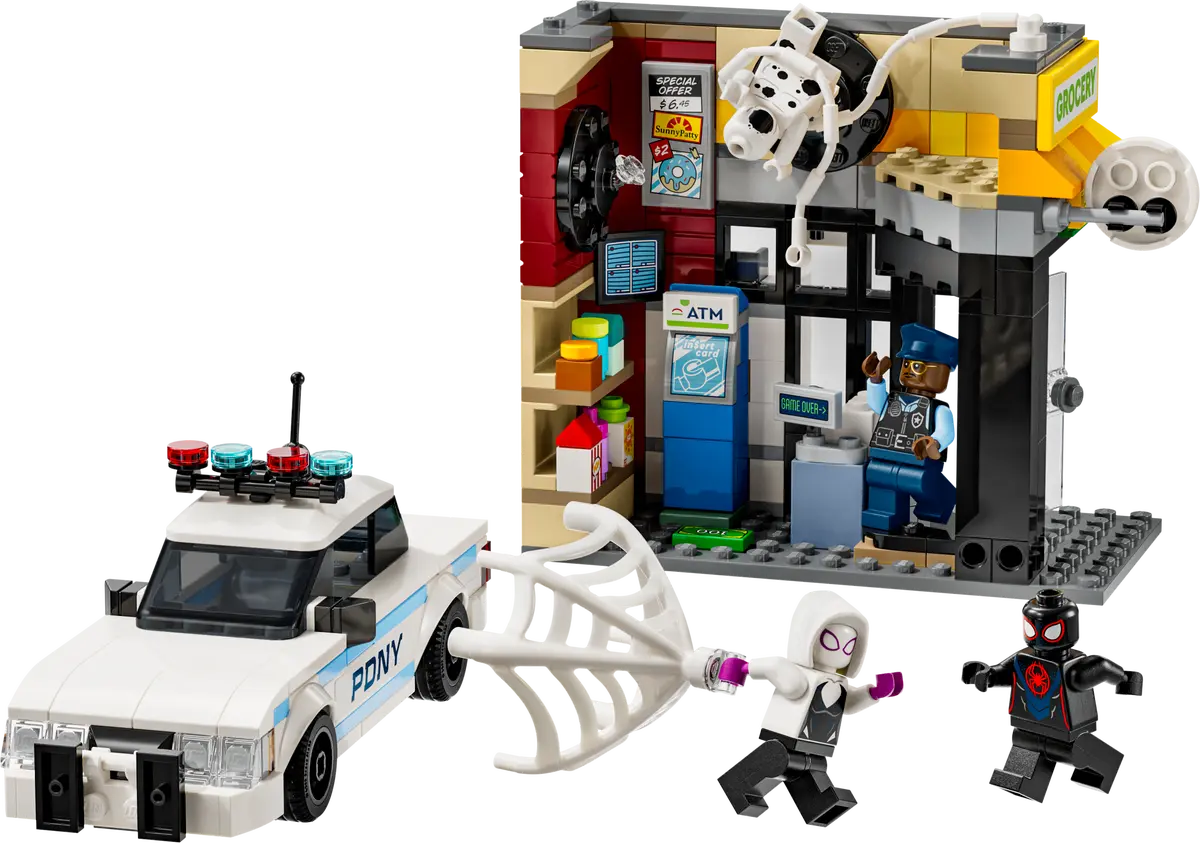 Zestaw zawiera cztery minifigurki: Milesa Moralesa, Spota, Gwen Stacy i oficera Jeffersona. Budynek sklepu ma funkcję wybuchającej ściany, która umożliwia wyciągnięcie bankomatu. Akcesoria obejmują długą, elastyczną linę pajęczą i elastyczną pajęczynę, w której zmieści się minifigurka. Radiowóz policyjny otwiera się, aby usadzić w nim dwie minifigurki.