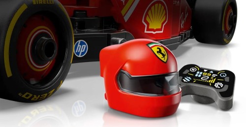 Model samochodu F1 ma kokpit otwierany przez podniesienie pałąka systemu halo, tylne skrzydło, zawieszenie typu wishbone, naklejki sponsorów i szersze tylne opony z napisem „Pirelli”. Bolid F1 zawiera także minifigurkę kierowcy w kombinezonie Ferrari i kasku, którego można umieścić w kokpicie i odgrywać wyścigi.