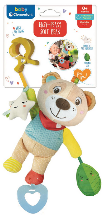 Plastikowe kółeczko i praktyczny zacisk umożliwiają powieszenie zabawki w dowolnym miejscu.