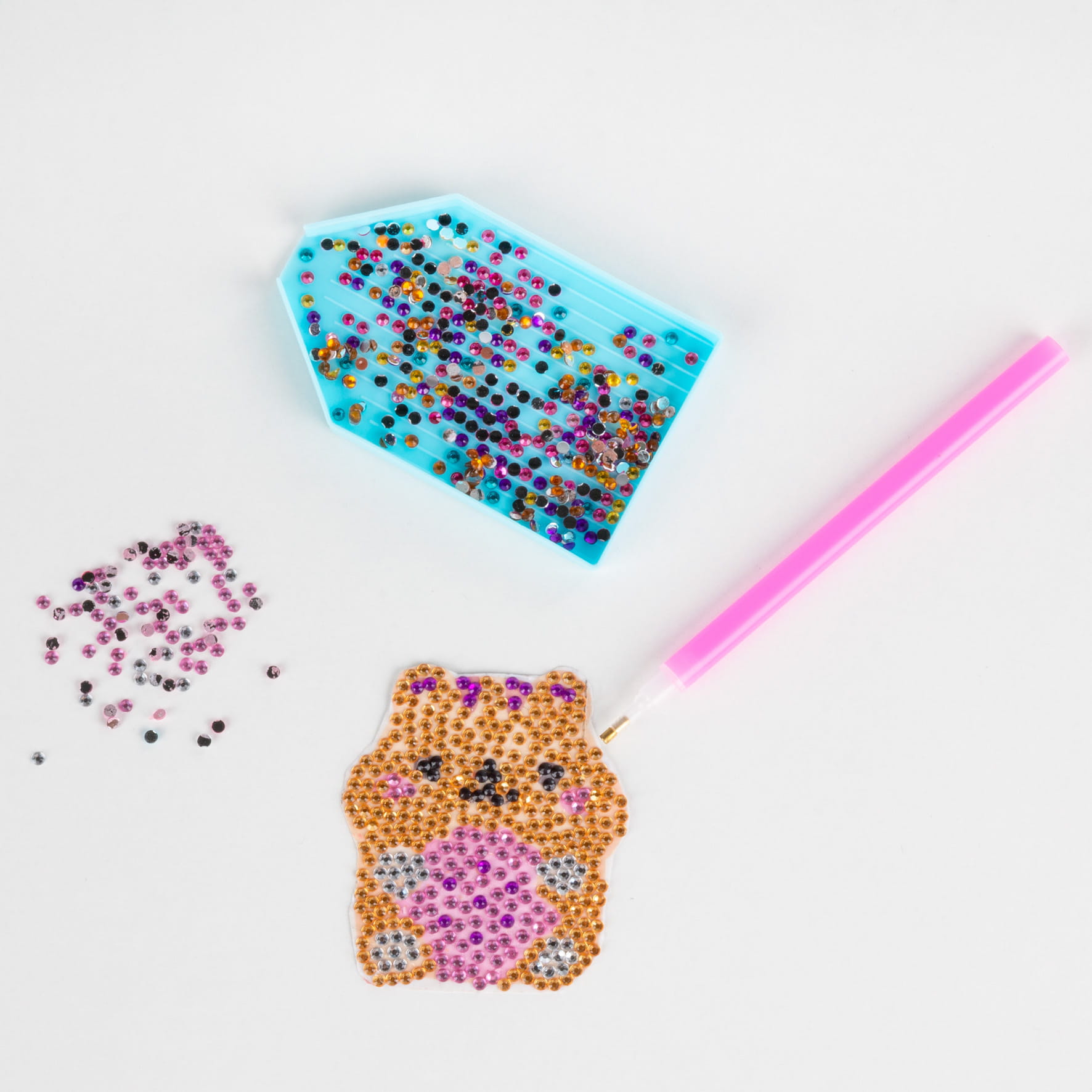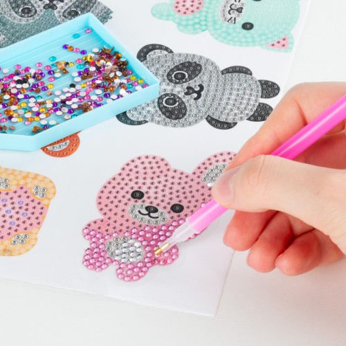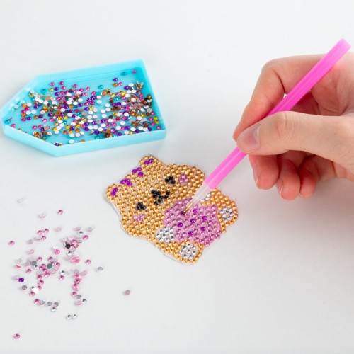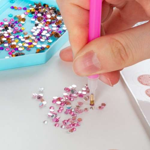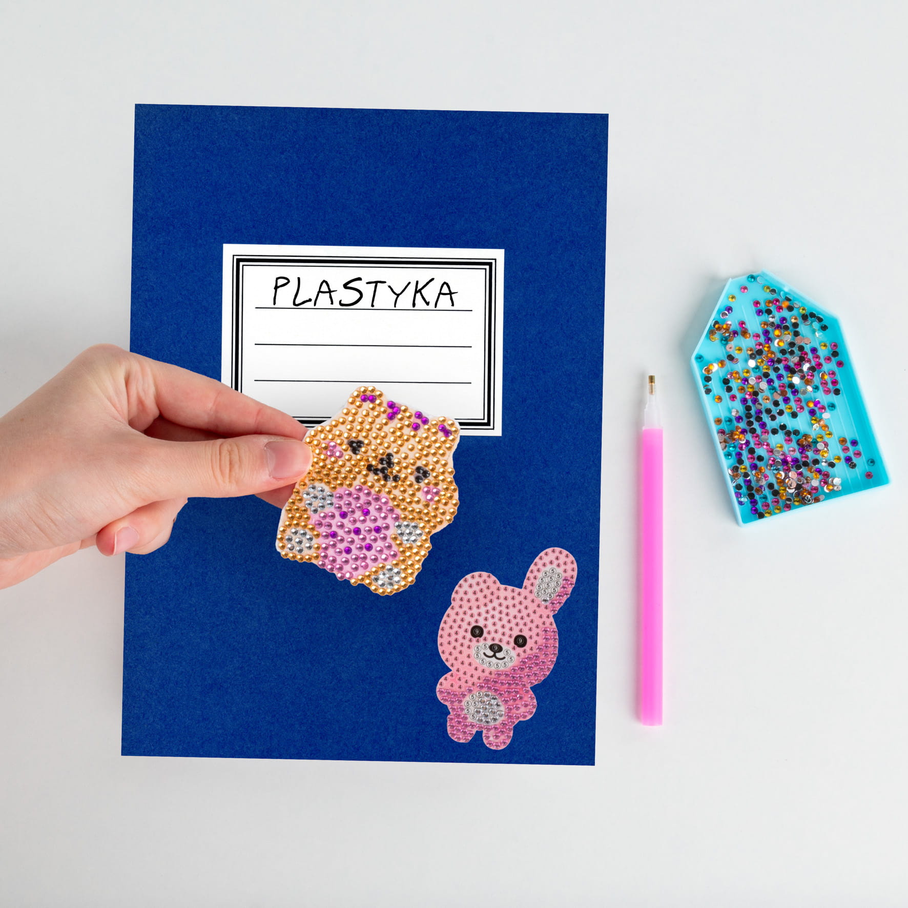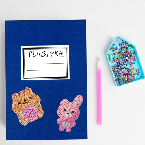 Do ozdbienia służy 500 błyszczących kryształków w 9 odcieniach, wraz z niezbędnymi akcesoriami: aplikatorem, tacką i woskiem. Układanie migoczących mozaik nie tylko odpreża i wycisza, ale pobudza też wyobraźnię i zdolności manualne. Gotowe naklejki mogą posłużyć jako dekoracja zeszytów, książek lub mebli dodając blasku i charakteru. Sprawdzi się zarówno jako rozrywka, jak i upominek dla młodych artystów.