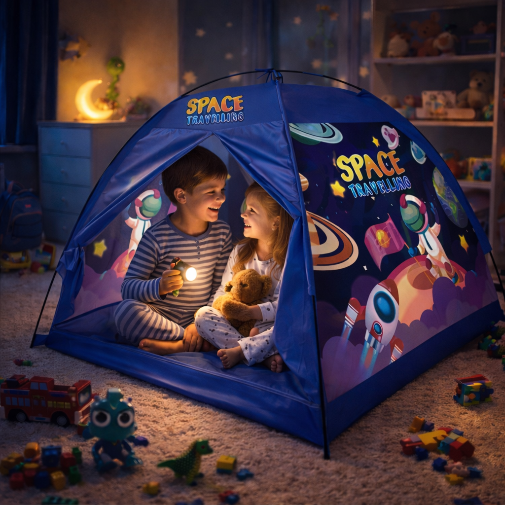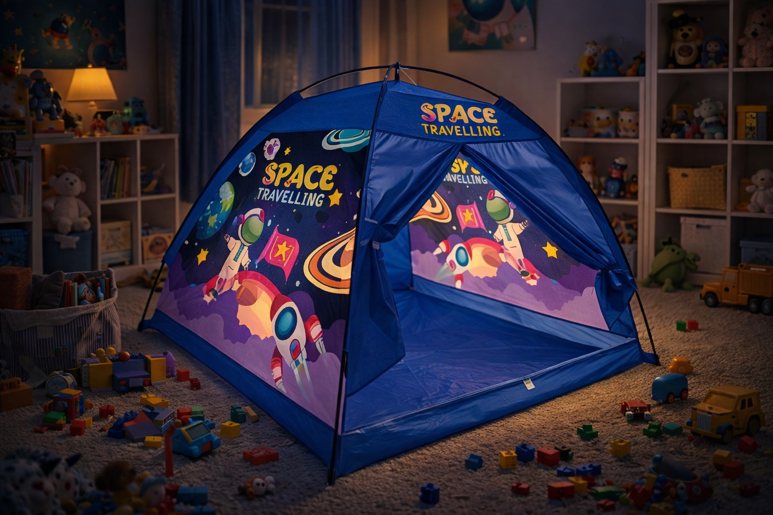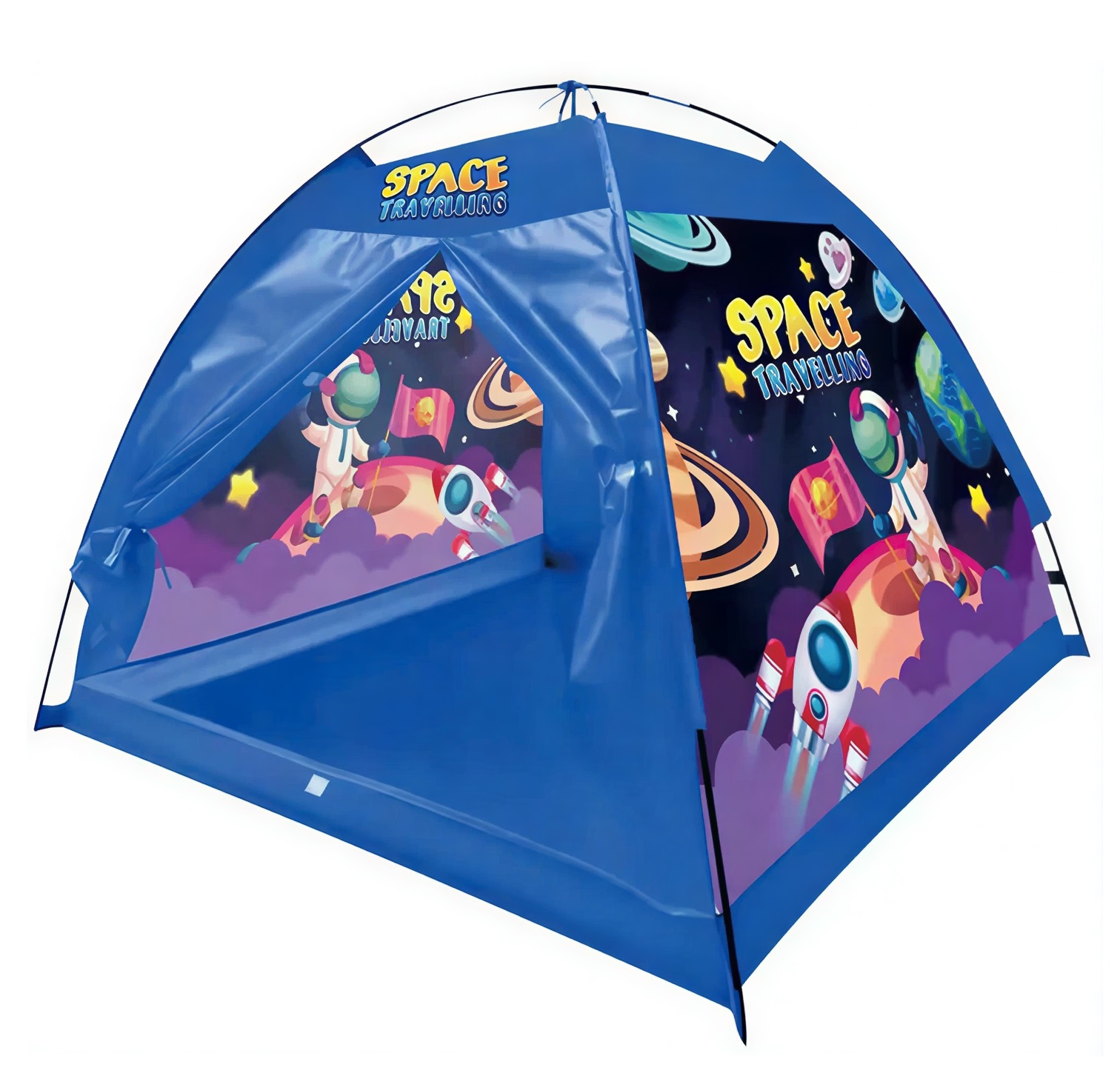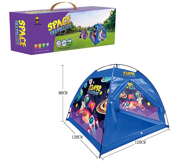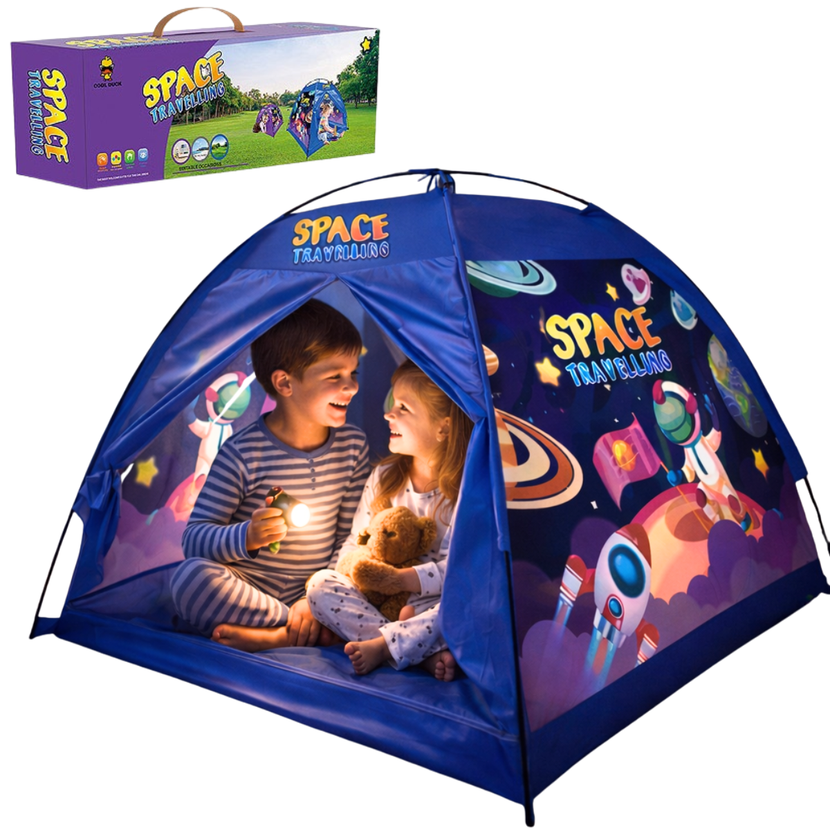 Kolorowy namiot „Space Travelling” to idealne miejsce do zabawy, odpoczynku i rozwijania wyobraźni.