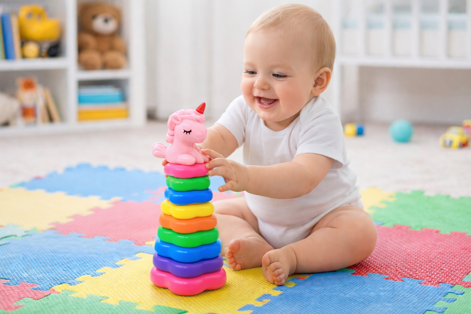 ✔️ Maluch układając krążki jeden po drugim, ćwiczy sprawność małych rączek i pobudza ciekawość.