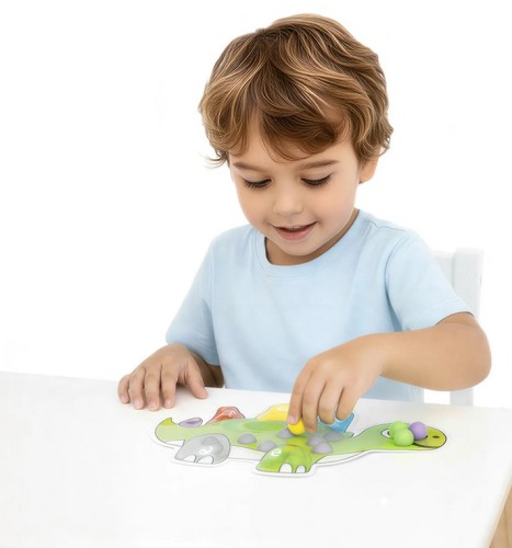Poznaj wyjątkową sensoryczną planszę dinozaur z miękkimi, kolorowymi kuleczkami, które dziecko przesuwa do odpowiednich miejsc, dopasowując je kolorystycznie i ilościowo. To idealna zabawka wspierająca naukę liczenia, rozpoznawania kolorów oraz rozwój motoryki małej.