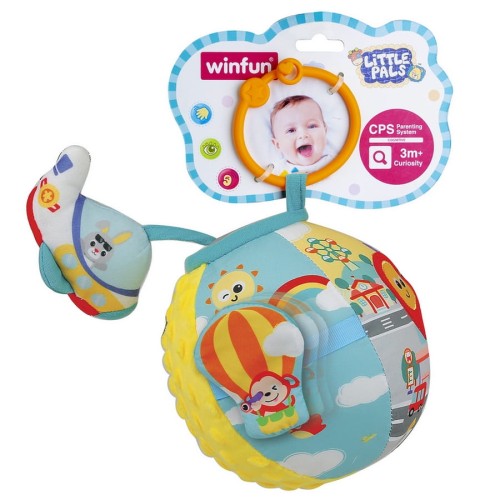 Pluszowa piłeczka z pięknie zilustrowanymi obrazkami, przyciągnie uwagę dziecka. Piłeczka ma kolorowe tkaniny o różnych wzorach i fakturach. Dodatkowo piłeczka ma aplikacje 3D z odstającym balonem i pluszowy samolocik na sznureczku.