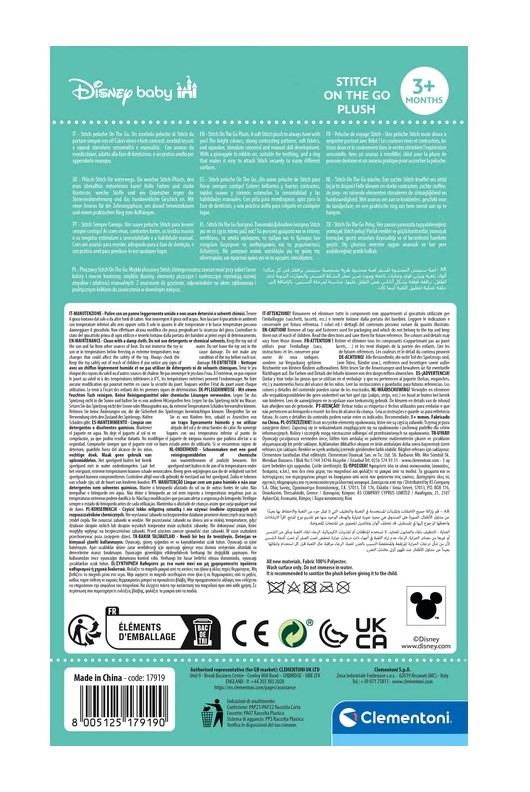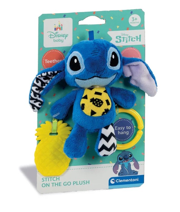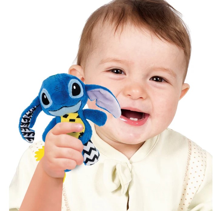 Stitch jest łatwy do trzymania, wspiera rozwój zmysłów dzięki elementowi gryzaka, wydawanego dźwięku i różnym materiałom.