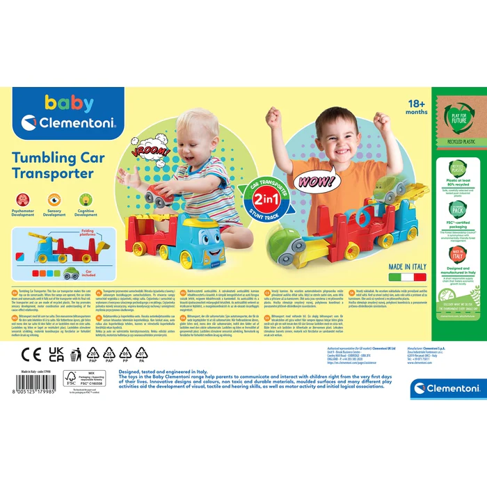 Kolorowa rozkładana ciężarówka zmienia się w transporter samochodzików! Transporter zmienia się w tor wyścigowy, po którym samochodzik z zestawu mknie, wywraca się i fika wesołe koziołki, rozbudzając ciekawość dziecka. Zabawka stymuluje sprawność manualną i wyobraźnię dziecka, które może używać ciężarówki do odtwarzania miejsc z rzeczywistego świata.