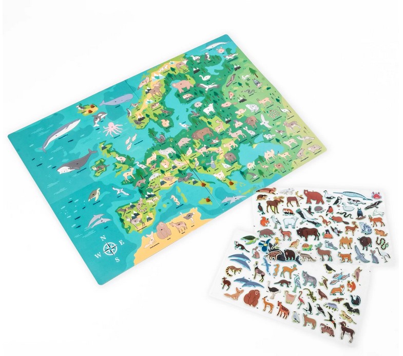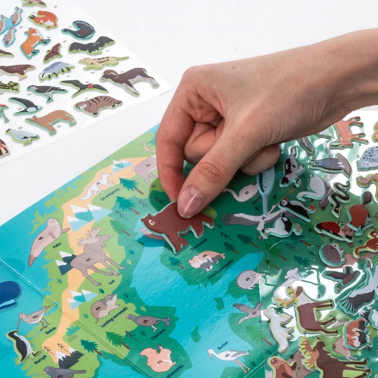 Zestaw zawiera naklejki ze zwierzętami, które można umieszczać na mapie zgodnie z oznaczeniami, aby zobrazować ich naturalne środowiska. Ta niezwykła zabawa rozwija jednocześnie wiedzę geograficzną i biologiczną.